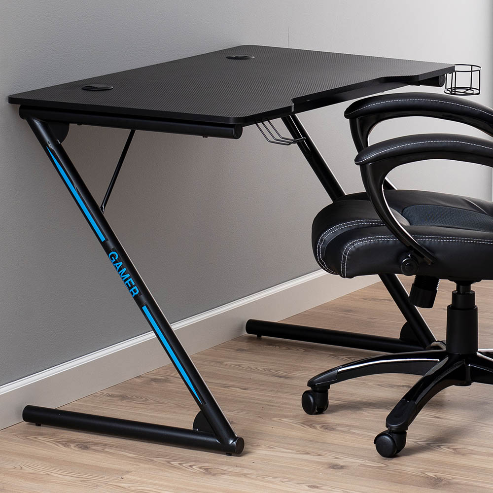 Elevate your gaming experience with this robust gaming desk. Its durable carbon rough melamine top and sturdy matte black steel base provide a solid foundation for intense gaming sessions. Conveniently equipped with a cup holder, headset hanger, and a wire management hole, this desk keeps your gaming space organised and clutter-free, ensuring an immersive and enjoyable gameplay experience.