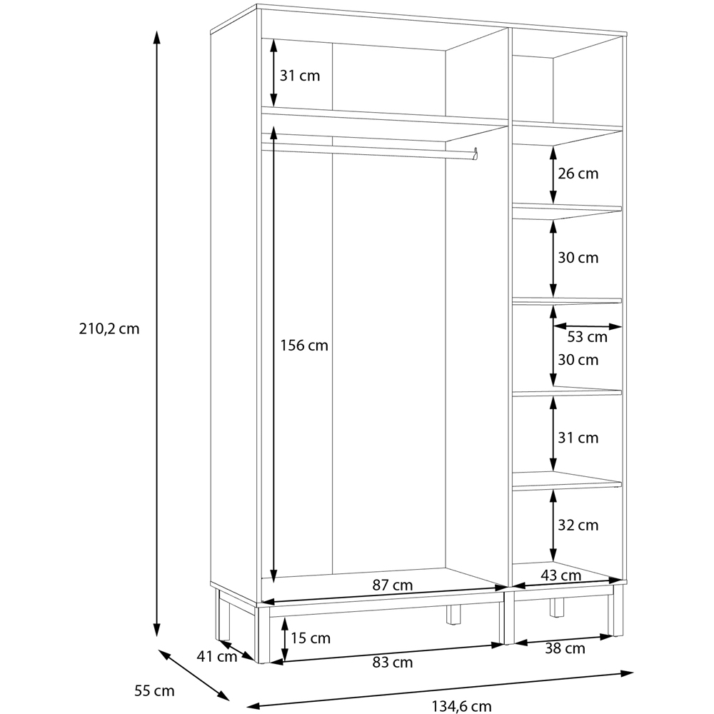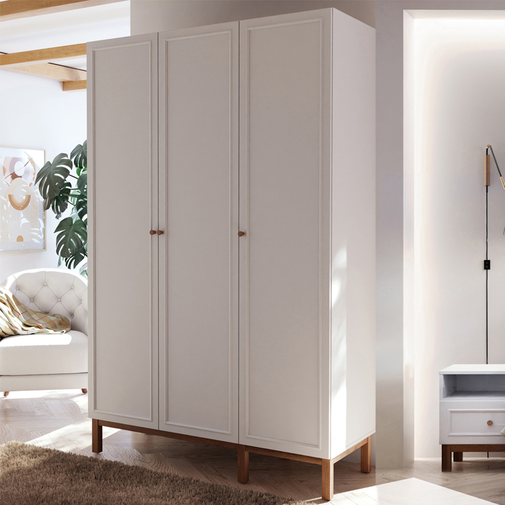 The Wensley 3-Door Wardrobe, in a stylish light grey and oak finish, offers a contemporary solution for bedroom storage. Its clean lines are complemented by elegant wooden knob handles and the smooth operation of soft-closing doors. Inside, you'll find ample space, cleverly organised with a hanging rail and six shelves. A perfect blend of form and function for the modern home.