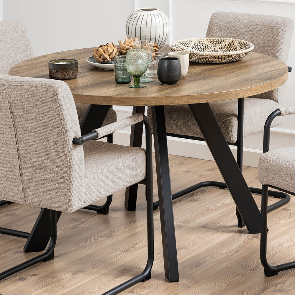 This stylish round table, with its oak-effect finish, comfortably seats four for everyday meals. Perfect for entertaining, simply add the two included extension leaves to accommodate eight guests. A blend of cool style and practical design.