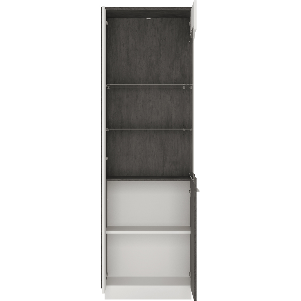 A statement piece featuring a spacious glazed display section and contrasting light and dark materials. Provides ample storage, ideal for showcasing cherished items. (Flat pack cabinet.