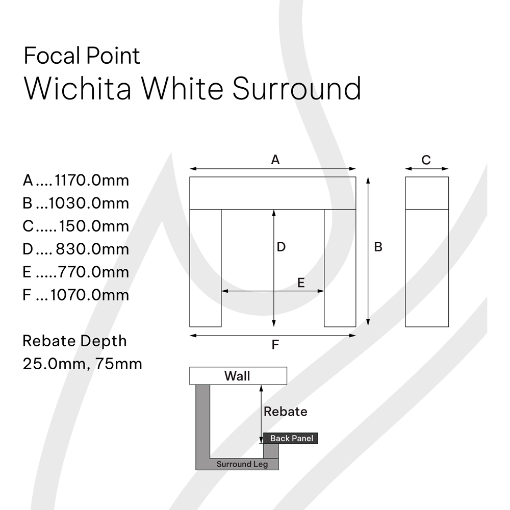 Transform your fireplace into a stunning focal point with the Wichita White surround. This elegant addition seamlessly blends classic charm with functional design. Supplied with all necessary fixings for secure wall mounting, it promises a straightforward installation and an instant upgrade to your living space. The innovative removable rebates (25mm and 75mm) offer exceptional adaptability, ensuring a flawless integration with a wide array of fireplace styles.