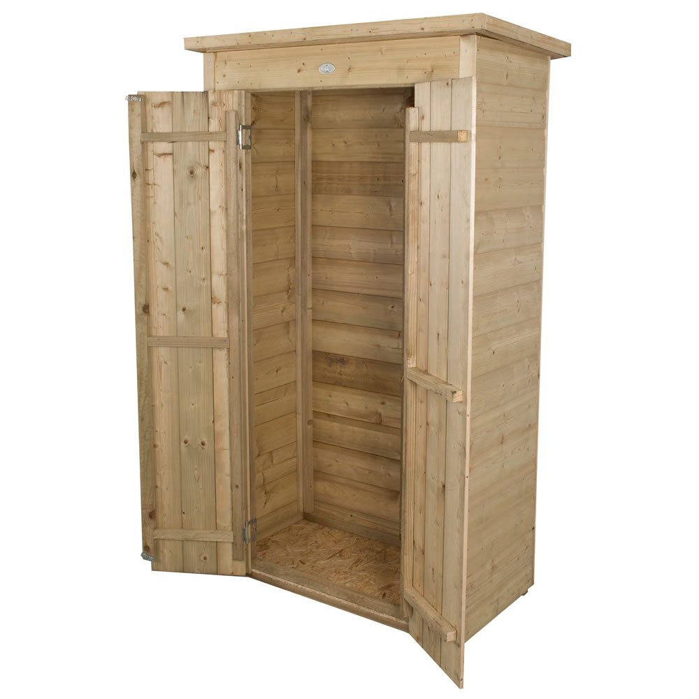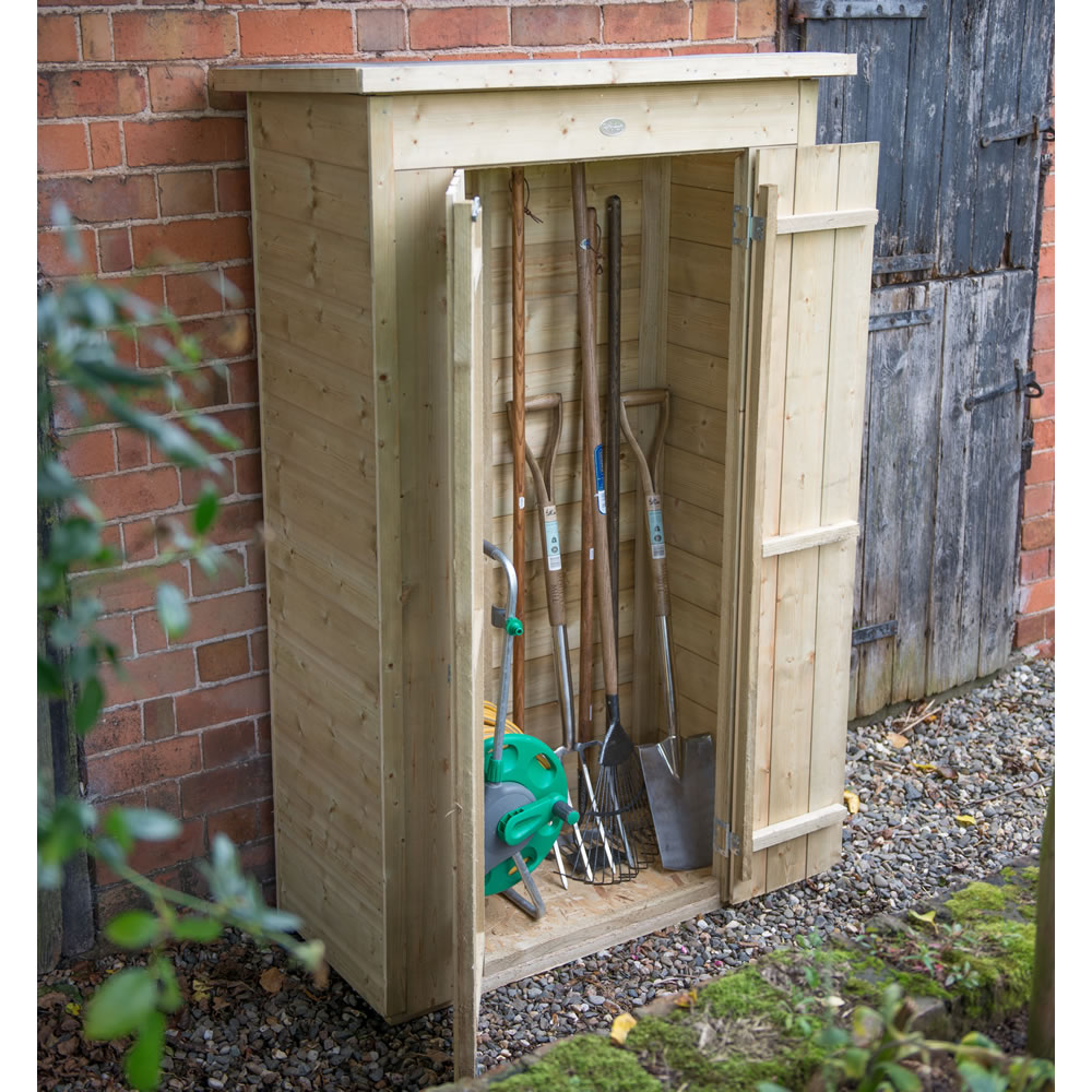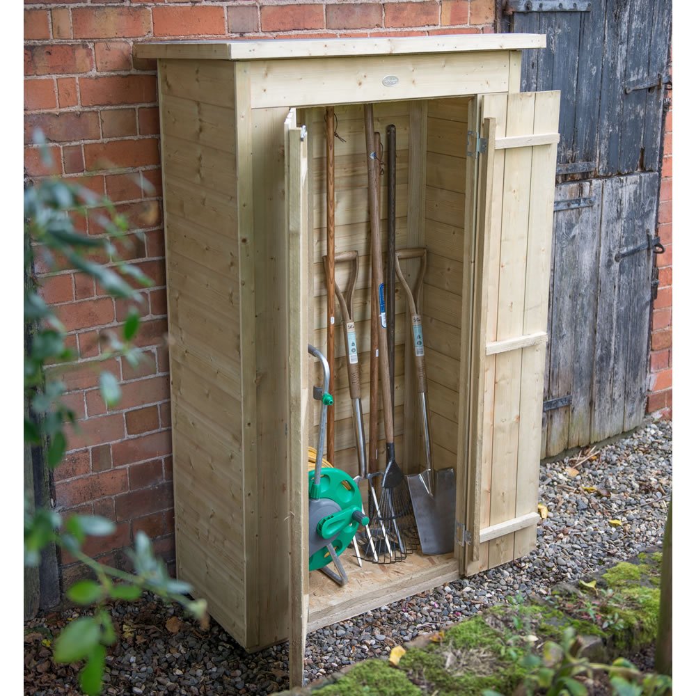 This stylish and practical garden store offers ample space to organise your outdoor equipment. Its compact design is ideal for wall or fence placement, enhancing your garden's aesthetic appeal. Boasting a 750-litre capacity and a near six-foot roof height, it comfortably accommodates a wide range of items. Crafted from smooth-planed, tight-fitting shiplap tongue and groove boards, the pressure-treated construction, incorporating an anti-fungal preservative, is guaranteed against rot and fungal decay for 15 years. The adjustable pent roof, covered with high-quality green mineral felt, ensures weathertight protection. Secure double doors, fitted with turn-buttons and a plate hasp and staple latch (padlock not included), safeguard your belongings. Finally, pressure-treated bearers raise the store off the ground, keeping it dry.