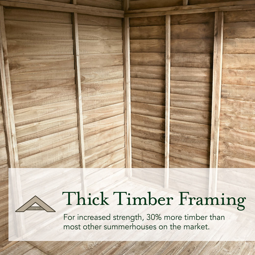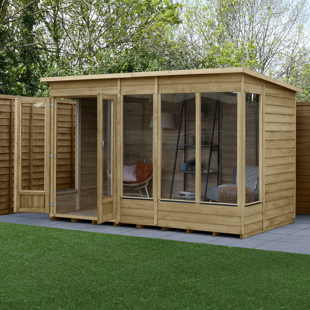 Enhance your outdoor space with the Forest Garden 4LIFE Double Door 5 Windows Pent Summerhouse. This charming structure, perfect as a hobby room or cosy reading nook, is a stylish addition to any garden. Its generous window design bathes the interior in natural light. Constructed with overlapping boards, this modular summerhouse offers a simpler assembly process thanks to its fully modular panels delivered in smaller sections. This design also provides greater flexibility in placement and a more robust build, maximizing the use of high-quality timber. Pressure-treated for lasting durability and backed by a 25-year anti-rot guarantee, it requires minimal maintenance and eliminates the need for preservative treatments. The sturdy timber floor supports heavier items, while the pent roof, crafted from durable 8mm solid sheet material and covered in green sand-felt, ensures complete weather protection. Made in the UK using FSC-certified timber, this premium summerhouse includes all necessary fixtures, fittings, and felt, along with clear assembly instructions. Ideal for smaller gardens, it measures 10 x 6ft.