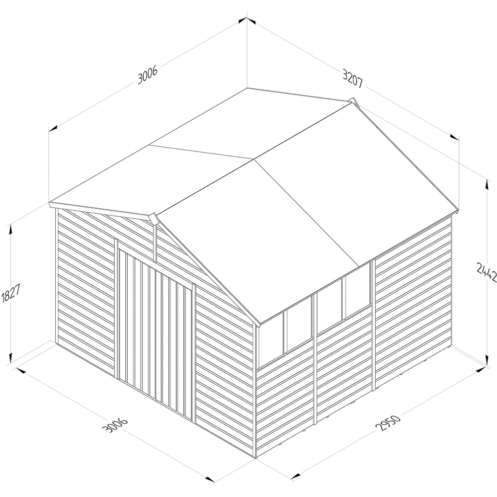The Forest Garden Beckwood 10 x 10ft Double Door 4 Windows Shiplap Apex Shed offers ample storage for your gardening needs and more. Proudly designed and manufactured in Britain, this robust shed is built to withstand the elements, providing a secure space for tools, bicycles, fishing equipment, or outdoor gear. Constructed using pressure-treated, interlocking shiplap cladding, it boasts a watertight seal and 30% thicker framing than comparable sheds, ensuring lasting durability. The pressure treatment includes a 25-year anti-rot guarantee, eliminating the need for annual preservative treatments. A heavy-duty tongue and groove floor supports heavier items, while the 8mm solid sheet roof offers reliable protection. Security features include a strong double-Z door frame, hidden hinges, and a heavy-duty pad bolt (padlock not included). The door is adaptable for either left or right-hand opening. Its traditional apex design complements any garden. A full set of fixings and clear instructions ensures straightforward assembly. Forest Garden’s white-glove delivery service includes drop-off at your desired garden location and packaging removal (to most UK addresses.