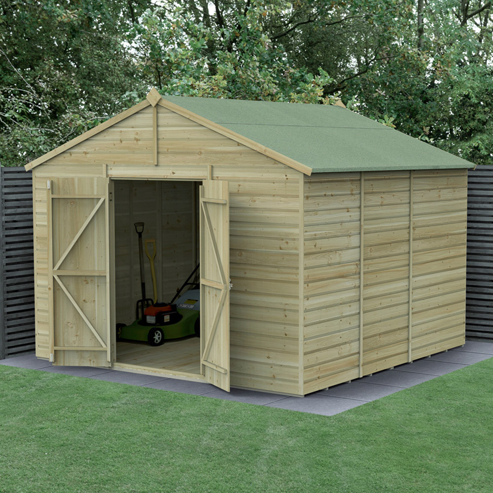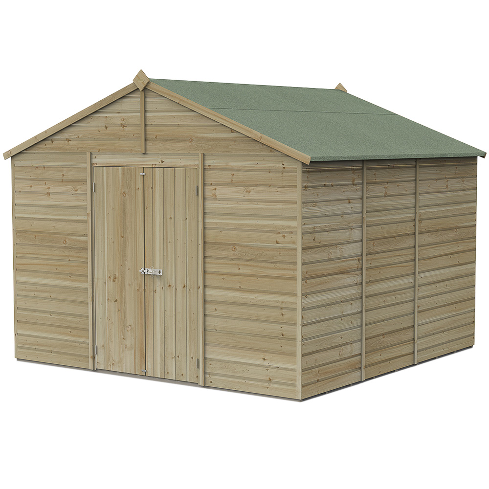 The Forest Garden Beckwood 10 x 10ft Double Door Shiplap Apex Shed offers ample storage for all your outdoor equipment. Proudly designed and manufactured in Britain, this robust shed is built to withstand the elements, providing a secure space for gardening tools, bicycles, fishing gear, or any other outdoor items. Constructed from pressure-treated, interlocking shiplap cladding, it boasts a watertight seal and a 25-year anti-rot guarantee (no annual treatment required). Its framing is 30% thicker than most wooden sheds, ensuring exceptional durability. The extra-thick interlocking tongue and groove floor is ideal for heavier items, while the 8mm solid sheet roof offers superior protection. Security features include a strong double-Z door frame, hidden hinges, and a heavy-duty pad bolt (padlock not included). The door is adaptable for left or right-hand opening. This traditional apex shed complements any garden, and comes complete with all fixings, clear instructions, and Forest Garden's white glove delivery service (free to most UK addresses, with placement in your chosen garden location and packaging removal.