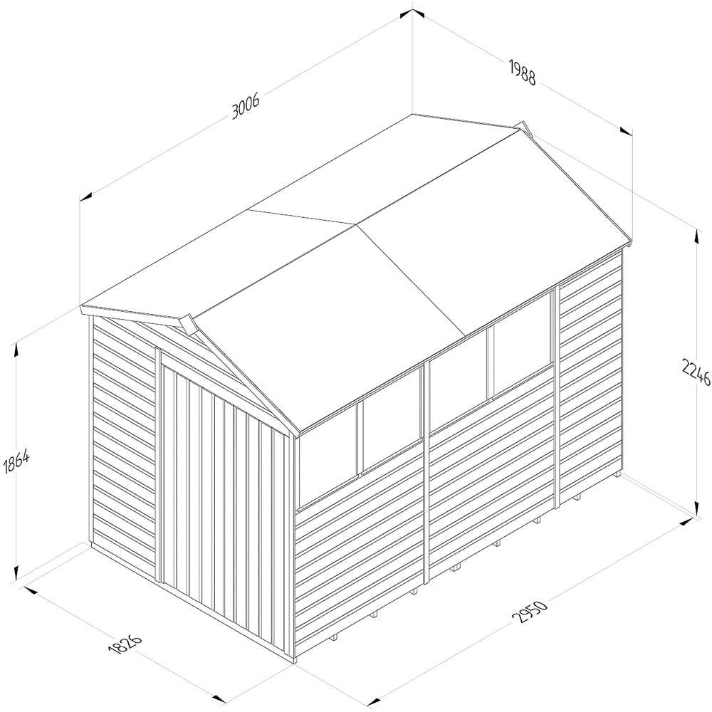 The Forest Garden Beckwood 6 x 10ft Double Door 4 Windows Shiplap Apex Shed offers ample storage for all your gardening needs and more. Proudly designed and manufactured in Britain, this robust shed is built to withstand the elements, providing a secure home for tools, bicycles, fishing equipment, or outdoor equipment. Constructed from pressure-treated, interlocking shiplap cladding, it boasts a watertight seal and a 25-year anti-rot guarantee (annual treatment not required). Its 30% thicker framing than comparable sheds ensures lasting durability, complemented by an extra-thick tongue and groove floor ideal for heavier items. The hardwearing 8mm solid sheet roof provides reliable protection, while the double-Z door frame, hidden hinges, and heavy-duty pad bolt (padlock not included) offer enhanced security. Choose a left or right-hand opening to suit your garden layout. The traditional apex roof adds a touch of classic charm. A full set of fixings and clear instructions ensures straightforward assembly. Delivered free to most UK addresses via a white-glove service, including placement in your chosen garden location and packaging removal.