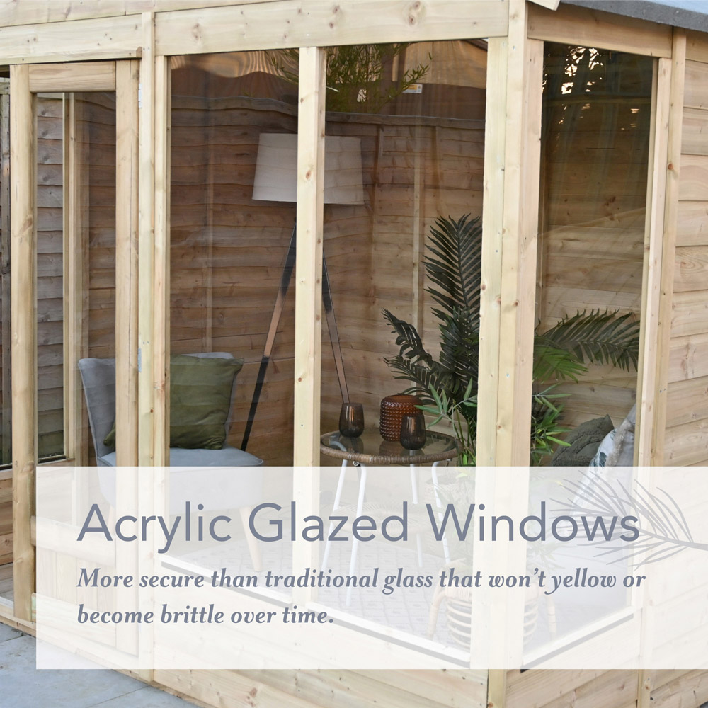 Create a garden haven that whispers timeless elegance with our new Beckwood Shiplap Summerhouses. Their classic coastal charm is achieved through precision craftsmanship and stylish shiplap construction, built for enduring quality. Enjoy a sophisticated retreat where lasting summer memories are made, in a structure designed to withstand the passage of time. Completely maintenance-free, these summerhouses require no annual preservative treatment. The pressure-treated timber boasts a market-leading 25-year anti-rot guarantee. A robust tongue and groove design ensures a seamless fit, enhancing both the aesthetic appeal and structural integrity. The tongue and groove pressure-treated boarded floor surpasses standard OSB flooring in strength and weight-bearing capacity, perfectly supporting garden furniture.
