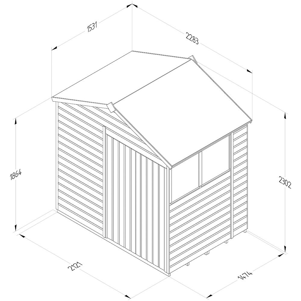 The Forest Garden Beckwood 7 x 5ft Double Door 2 Windows Shiplap Apex Shed offers ample storage for all your gardening needs and more. Proudly designed and manufactured in Britain, this durable shed is built to withstand the elements, providing a secure home for your tools, bicycles, fishing equipment, or outdoor equipment. Constructed from robust, interlocking pressure-treated shiplap cladding, it boasts a watertight seal and a 25-year anti-rot guarantee (pressure treatment applied). Its framing is 30% thicker than most wooden sheds, ensuring longevity. The extra-thick interlocking tongue and groove floor comfortably supports heavier items, while the hardwearing 8mm solid sheet roof offers superior protection. Security features include a strong double-Z door frame to prevent movement, hidden hinges, and a heavy-duty traditional pad bolt (padlock not included). The door is adaptable for left or right-hand opening. This attractive apex roof design complements any garden. A complete set of fixings and clear instructions ensures a straightforward assembly. Forest Garden's white-glove delivery service includes placement in your chosen garden location and packaging removal (free to most UK addresses.