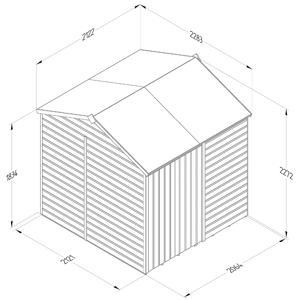 The Forest Garden Beckwood 7 x 7ft Double Door Shiplap Reverse Apex Shed offers ample storage for garden tools, bicycles, fishing equipment, and outdoor gear. Proudly designed and manufactured in Britain, this robust shed is built to withstand all weather conditions. Its construction utilizes pressure-treated, interlocking shiplap cladding, creating a watertight seal. Featuring 30% thicker framing than comparable sheds, it ensures lasting durability. The pressure treatment provides a 25-year anti-rot guarantee, eliminating the need for annual preservative treatments. A reinforced, extra-thick interlocking tongue and groove floor supports heavier items. The roof is crafted from hardwearing 8mm solid sheet material. Security is enhanced by a double-Z door frame preventing movement, hidden hinges, and a heavy-duty pad bolt (padlock not included). The door is adaptable for left or right-hand opening. The reverse apex roof design complements any garden. A complete set of fixings and clear instructions ensures straightforward assembly. Free delivery to most UK addresses includes placement in your chosen garden location and packaging removal.