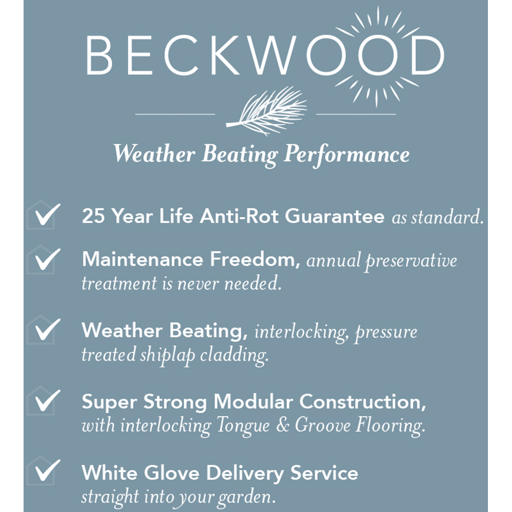 Escape to timeless elegance with our new Beckwood Shiplap Summerhouses. These beautifully crafted summerhouses bring classic coastal charm to your garden. Built for enduring quality, their shiplap construction offers both durability and sophisticated style. Enjoy a haven designed for lasting summer memories, built to withstand the test of time. Completely maintenance-free, these summerhouses require no annual preservative treatment. The pressure-treated timber boasts a market-leading 25-year anti-rot guarantee. A robust tongue and groove design ensures a seamless, strong fit, enhancing both the aesthetics and structural integrity. The tongue and groove pressure-treated boarded floor provides superior strength compared to standard OSB flooring, comfortably supporting heavier furniture.