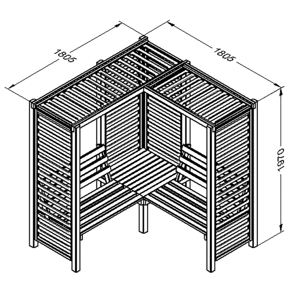 The Forest Garden Firenze 4 Seater Corner Arbour transforms any garden corner into a tranquil haven. Its right-angled design, featuring two comfortable benches, provides ample seating for four. The slatted roof, perfect for climbing plants, creates a shaded retreat during warmer months, while the sturdy pressure-treated timber construction guarantees lasting enjoyment with a 15-year rot and decay guarantee. This large arbour, a standout in the Forest range, measures 6.4 x 5.9 x 5.9 ft and is delivered flat-packed with all necessary fixings and instructions for a straightforward assembly. Enjoy your al fresco gatherings in style.