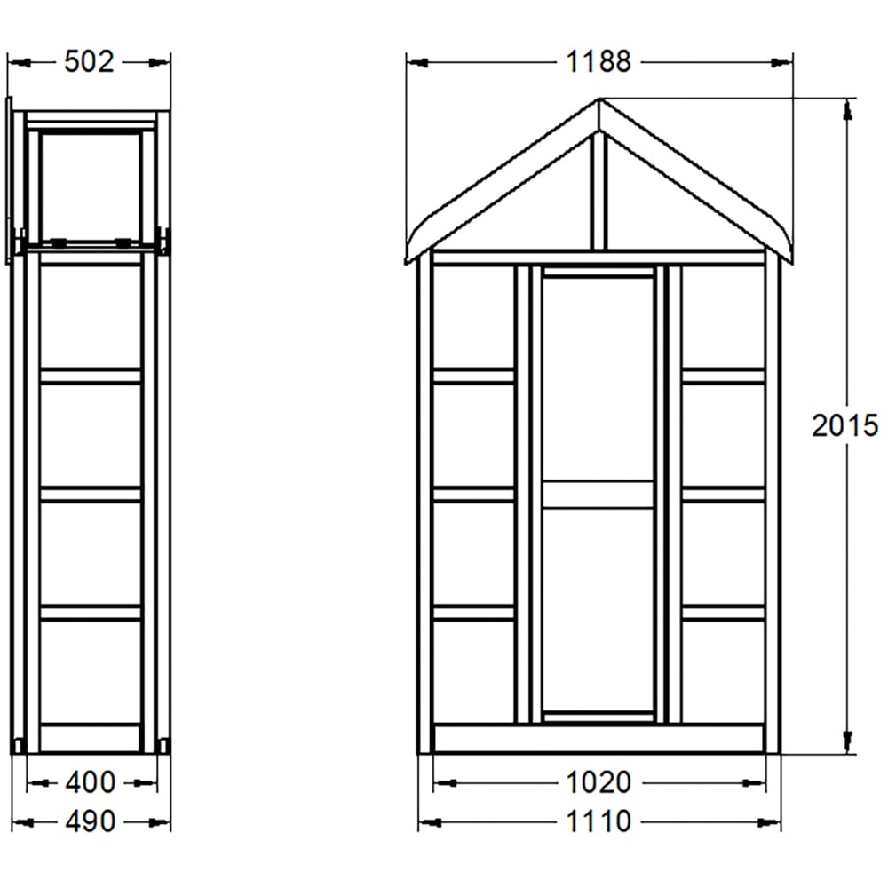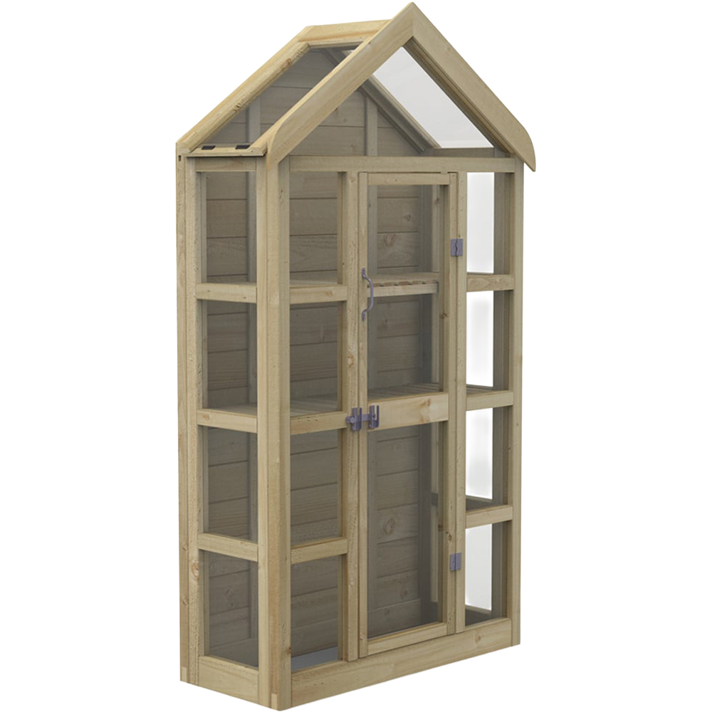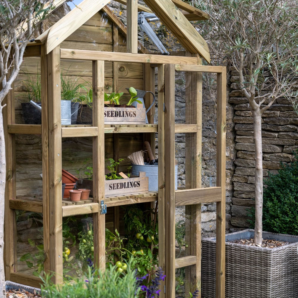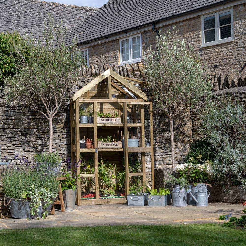 Make the most of even the smallest garden space with our Georgian Tall Wall Greenhouse. Its elegant, steeply pitched Georgian-inspired roofline creates a stunning focal point, while offering secure protection for your precious plants in any weather. Unlike many greenhouses, its back panel design means it doesn't need to be positioned against a wall. The tall, slender panes maximise light penetration, and a single opening window with automatic vent ensures optimal temperature and airflow. Removable shelving provides ample space for taller pots, allowing plants to thrive from base to apex – perfect for grow bags. Constructed from watertight, FSC® certified tongue and groove timber cladding, pressure treated for a 15-year anti-rot guarantee against fungal decay, this greenhouse is supplied unpainted, allowing for complete personalisation.