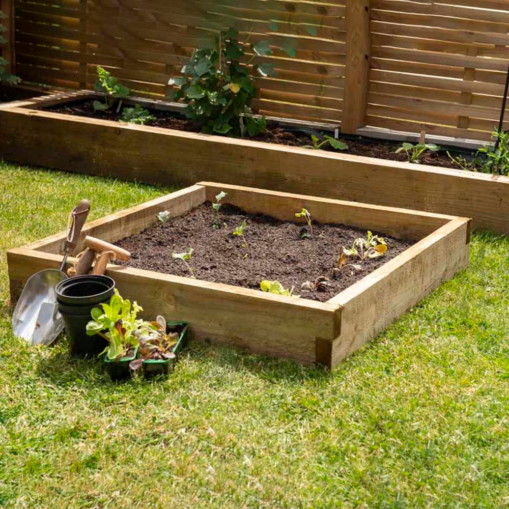 Enjoy growing your own fresh produce in this charming Caledonian Square Raised Bed. Its traditional square design makes a stylish statement in any garden, while offering a practical solution for growing vegetables and herbs in a compact space. Made from strong, 40mm thick timbers, 140mm deep, this raised bed is easy to assemble using the included screws and instructions. The timbers are notched for neat half-lap joints at the corners. Pressure-treated for lasting protection against rot, the wood comes with a 15-year guarantee. At 90cm x 90cm, it's the perfect size for a kitchen garden. For growing food, line the bed with a membrane before adding soil.