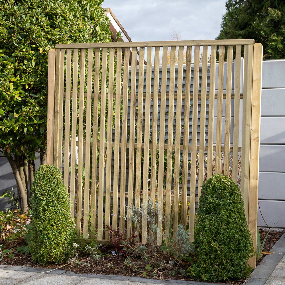 This versatile slatted garden screen offers a contemporary solution for any garden. Its robust, pressure-treated construction ensures longevity, providing a strong and attractive framework for climbing plants. Ideal for creating privacy screens, dividing garden areas, such as framing an outdoor dining area, or as a wall-mounted trellis added to a planter, this panel's clean lines make it a stylish addition. Mount it vertically or horizontally to suit your needs. Measuring 1.8m x 1.8m, it's also available in other sizes to create larger screening solutions.
