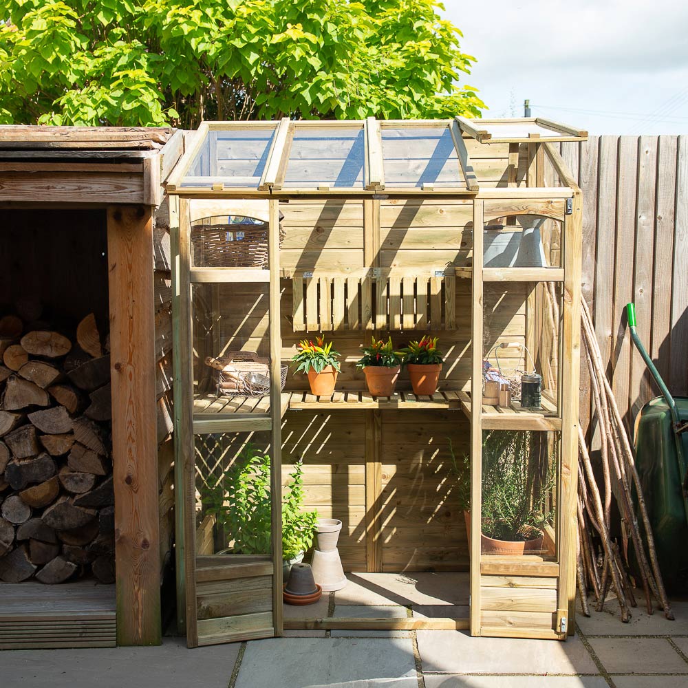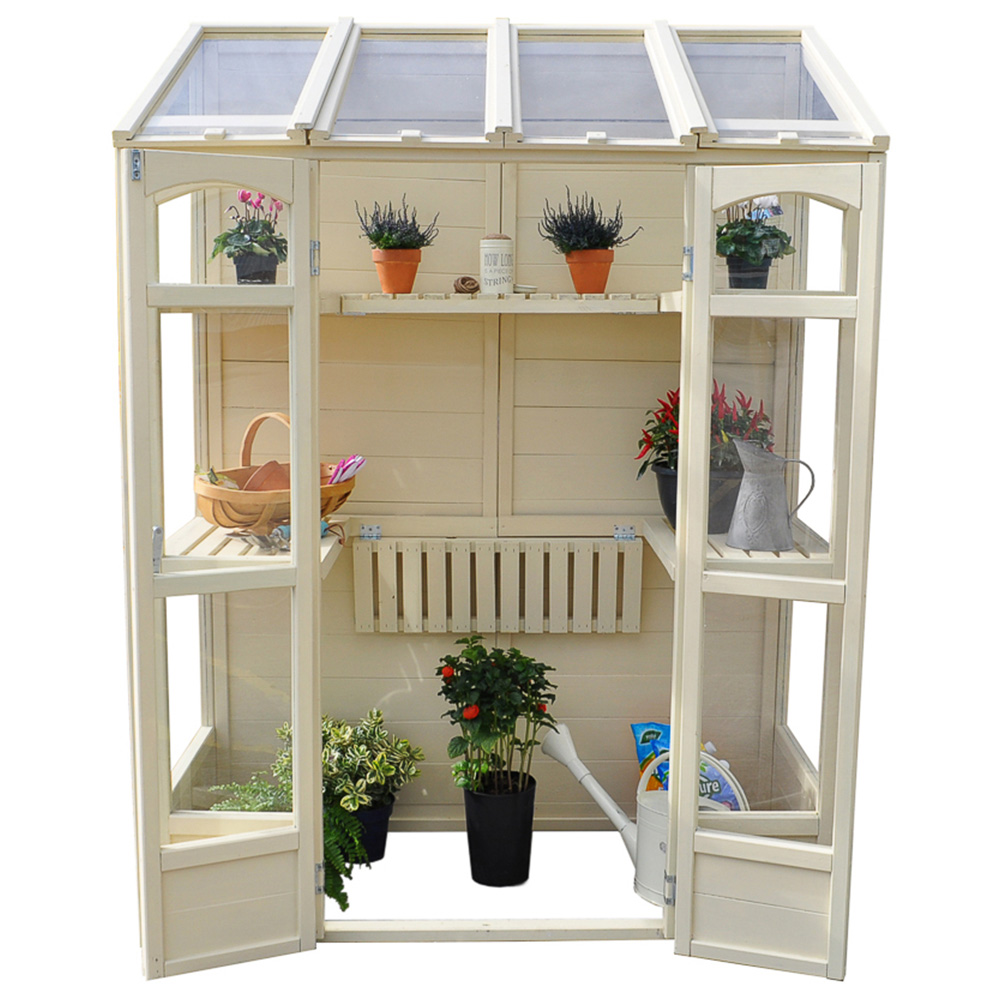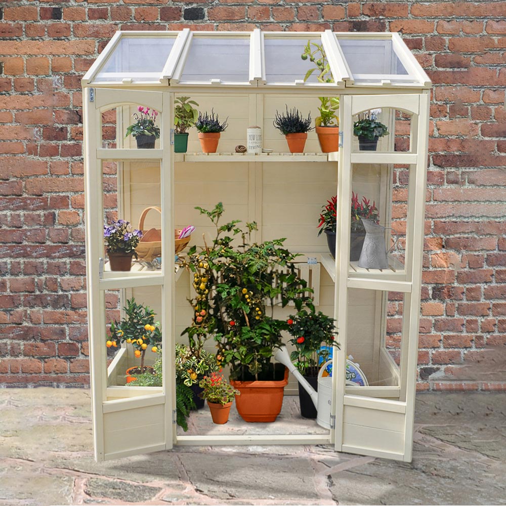The Forest Garden Victorian Double Door Tall Wall Greenhouse is a stylish and practical addition for any garden, perfect for those with limited space. Its traditional design is sure to be a conversation starter. Built with a back panel, it doesn't require a wall for support, ensuring your plants stay protected. Two levels of staging allow for organised plant placement, maximizing sunlight for healthy growth. A collapsible middle staging makes room for taller plants like tomatoes in grow bags. Acrylic glazing and two opening roof vents maintain ideal temperature and airflow. Double doors make planting and potting a breeze. Constructed from watertight tongue-and-groove cladding using FSC-approved timber, this greenhouse boasts a 15-year rot and fungal decay guarantee. Easy assembly with comprehensive instructions is included. Supplied unpainted, allowing for your personal touch with a coat of paint. Compact in size, this greenhouse is ideal for gardens with restricted space.