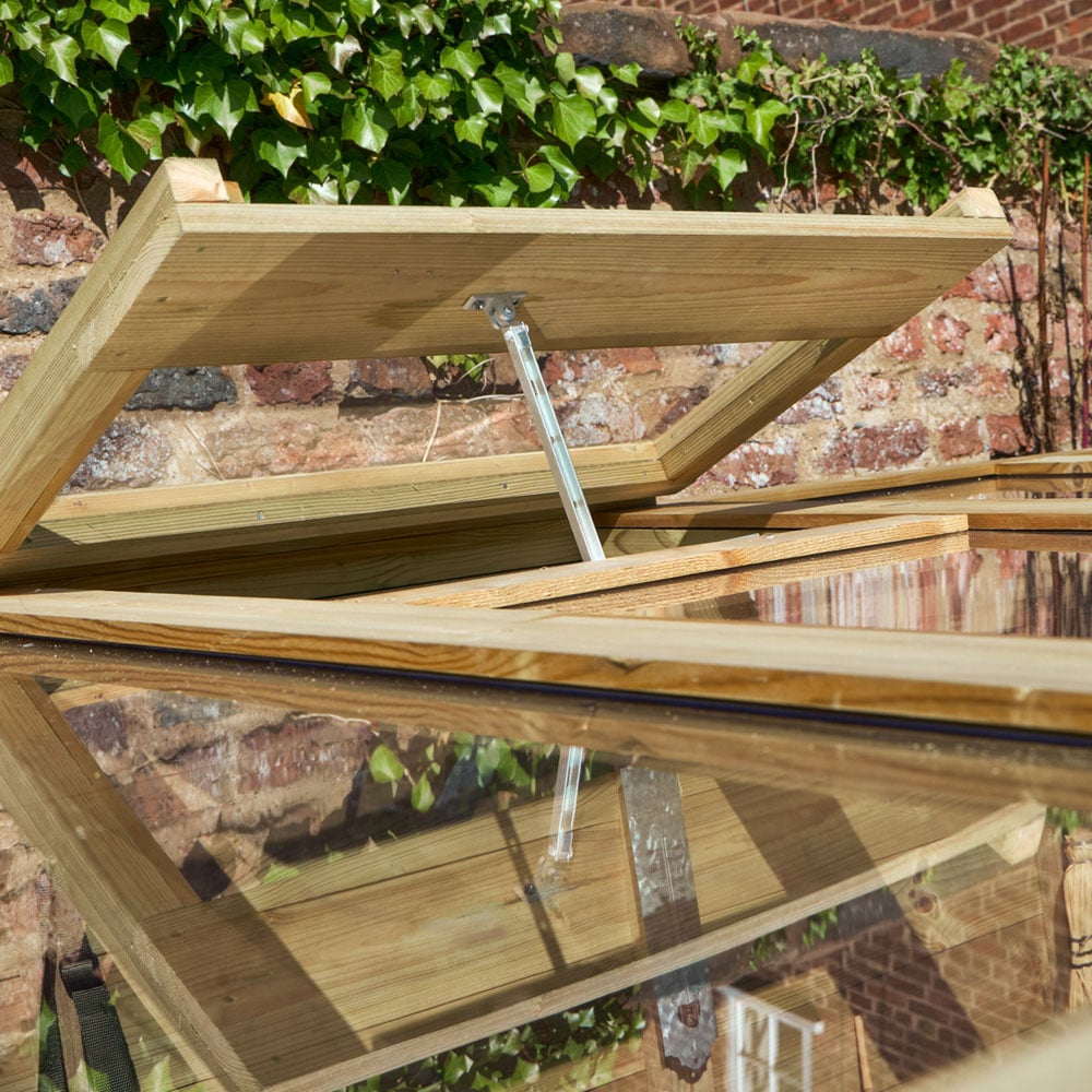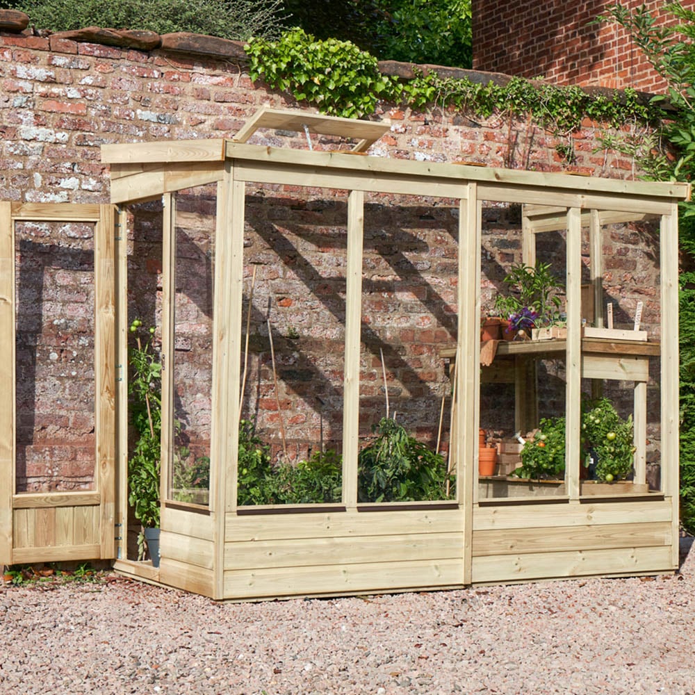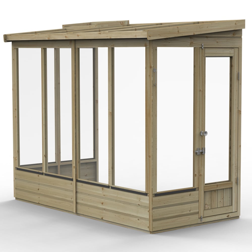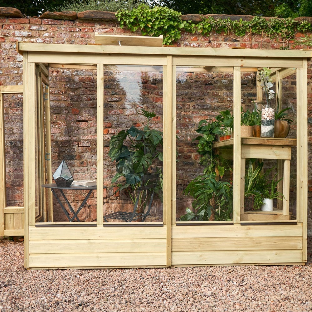 This 4ft x 8ft lean-to greenhouse is the perfect addition to smaller gardens or urban spaces, providing a haven for year-round plant cultivation. Its space-saving design attaches neatly to an existing wall, making the most of limited outdoor areas. Crafted in Great Britain using sustainably sourced FSC®-certified pressure-treated timber, this greenhouse boasts premium horizontal interlocking 12mm shiplap tongue and groove cladding. The robust wooden framing reinforces the cladding, creating a durable structure built to last. A convenient opening roof window allows for temperature regulation, while the pent roof design prevents water accumulation. The single door offers flexible placement on either gable end. UV-resistant acrylic glazing maximises light penetration while ensuring safety and shatter resistance. The floorless design promotes efficient drainage. This greenhouse comes with a 15-year guarantee against rot and fungal decay. Detailed instructions are included for straightforward assembly. For optimal longevity, treat the timber with a wood preservative and waterproof top coat within 14 days of installation and annually thereafter.