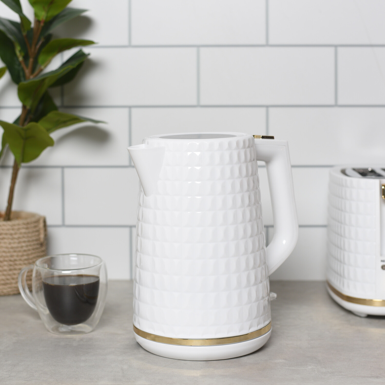 Effortlessly elevate your kitchen style with the Forte Plastic Kettle. Its sleek, square design, available in classic black or crisp white with a textured finish, complements any décor. Boasting a concealed heating element and 360-degree cordless functionality, brewing your favourite beverage is now simpler than ever. This 1.7L kettle ensures you always have enough hot water on hand.