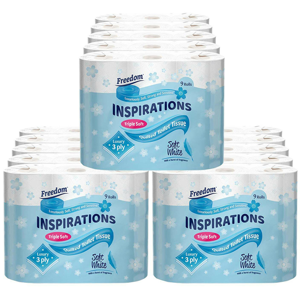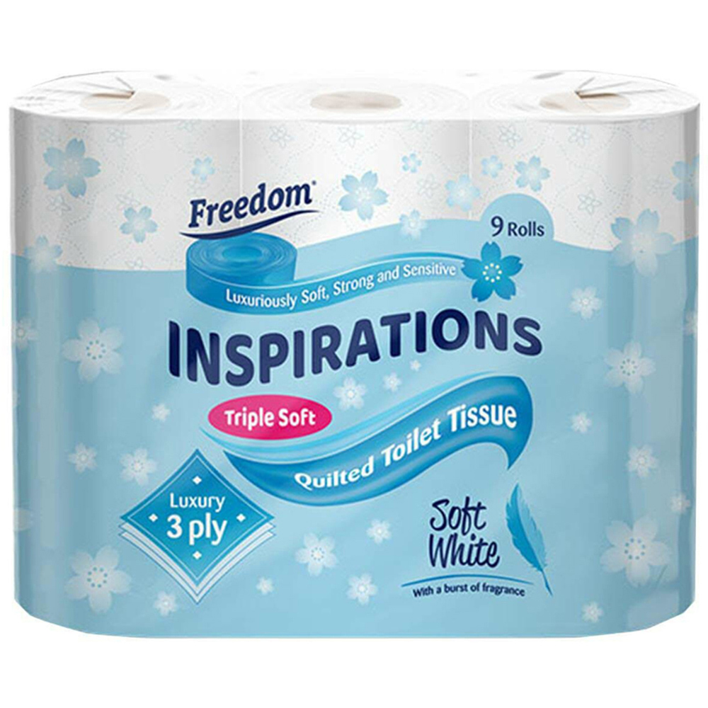 Designed for cleanliness and comfort, this Freedom Inspirations Quilted White Toilet Paper makes everyday life a little easier. Each three-ply sheet offers a balance of softness and strength, leaving you and your family feeling fresh and clean. The luxurious quilted surface and deco-embossed design on pure white pulp paper provide a feeling of softness and luxury. Made in the UK with sustainably sourced virgin pulp, each toilet roll is sustainably sourced. This pack contains 90 rolls (10 packs of 9 rolls), with 160 sheets per roll. The sheets feature micro-impressions for an ultra-soft-to-touch, absorbent, and strong texture. Hypoallergenic and safe for sensitive skin, this toilet paper helps remove odour-causing bacteria, ensuring a clean and fresh feeling. Ideal for everyday use, it's soft, strong, and absorbent.