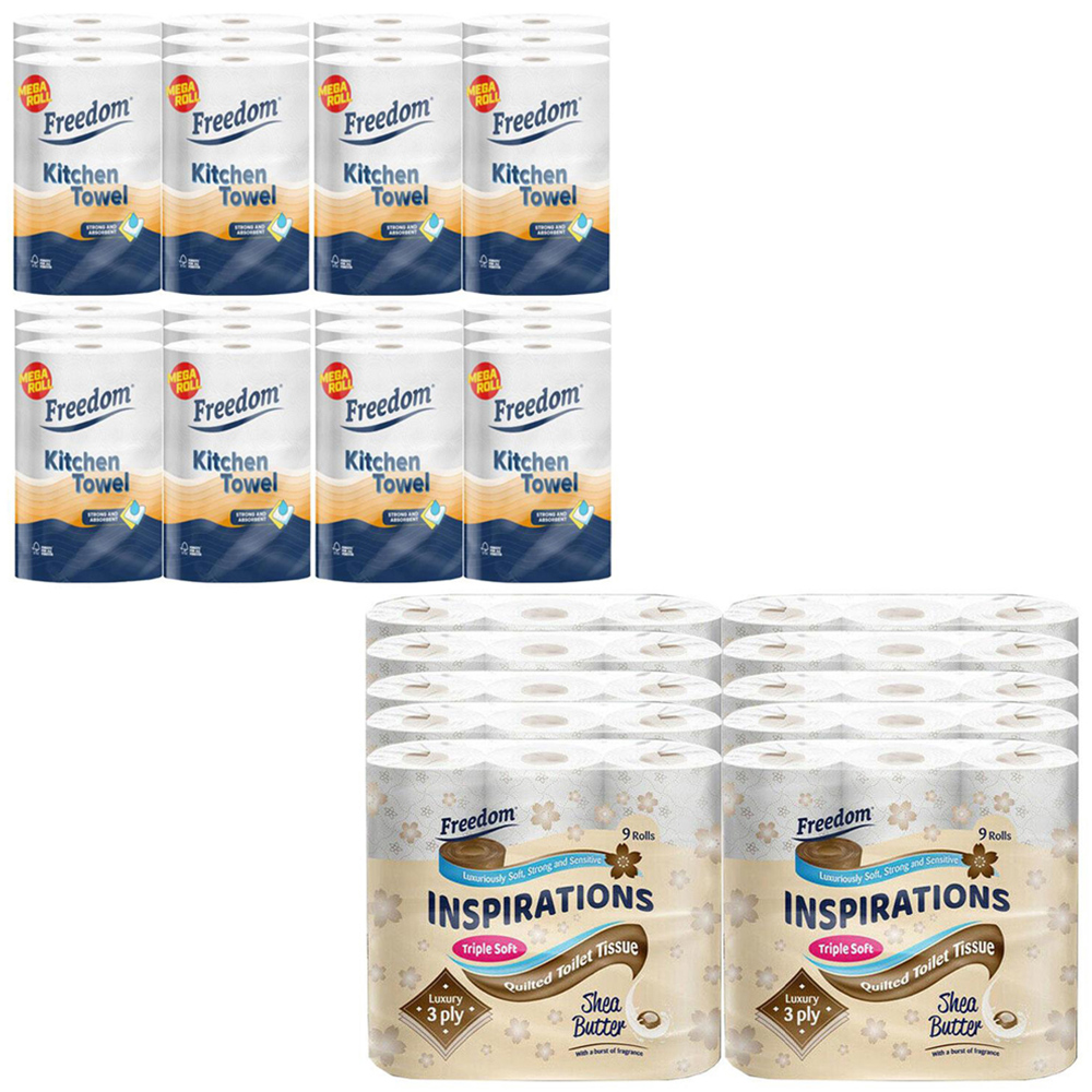 Freedom Shea Butter Toilet Paper 90 Rolls 3 Ply with 24 Rhino Jumbo Kitchen Towel Rolls