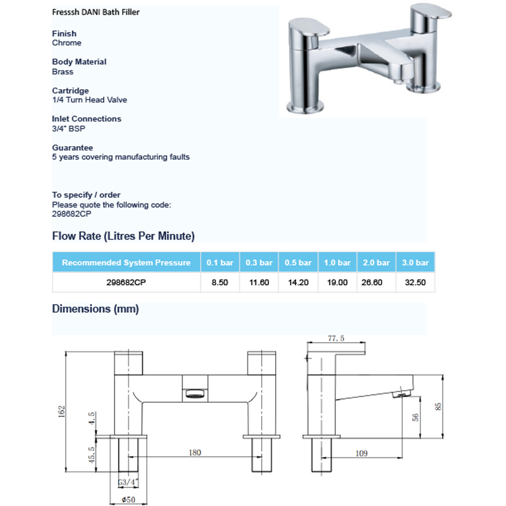Enhance your bathroom's aesthetic with the Fresssh Dani bath filler. Its minimalist chrome design offers effortless control over water temperature and flow, adding a touch of modern elegance. A perfect complement to various bathroom styles.