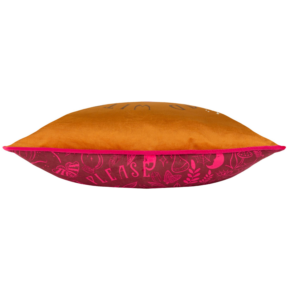 Add a touch of spooky chic to your home with this Bad Witch Vibes Pumpkin velvet cushion. Its luxuriously soft, yet hard-wearing velvet cover features a mysterious symbols print, complemented by a plain velvet reverse and zip closure. The piped edges add a touch of sophistication, while the premium materials ensure lasting comfort and support. Transform any ordinary or dull space with this unique and inviting cushion, perfect for unwinding after a long day.