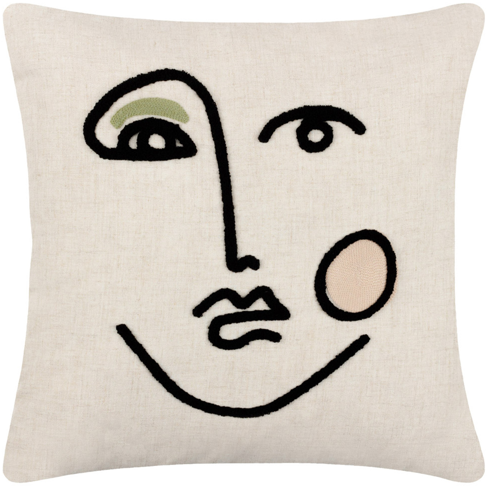 Elevate your space with the Cleo cushion, a stylish addition for sofas and beds. Its linear abstract design, accented by a charming crewel-embroidered eyebrow and beauty spot, is rendered on a luxurious polylinen front. Enjoy the plush comfort of its soft velvet reverse. Available in pink and green. This cushion effortlessly blends into modern, on-trend interiors.