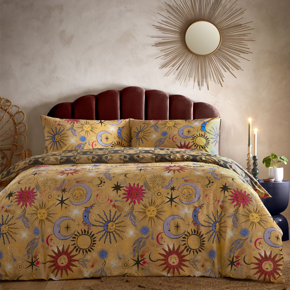 Bring some positive energy to your room with this furn. Ethereal Star Double Gold Rust Reversible Duvet Set. Featuring brightly shining moons and shooting stars, it takes you to a celestial eutopia. Made from sustainable fabrics, it carries a palette of bright pinks, rusts, and cobalt blues balanced with stardust gold it's both stylish and comfy. Offering a reversible, it's perfect for a midweek refresh.