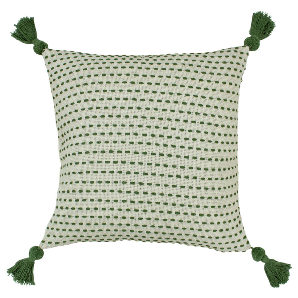 Elevate your space with this stylish embroidered cushion. Bring comfort and texture to your sofa or bed with its soft, linen-look fabric in a calming sage green. The stitched striped design adds a touch of modern elegance, while the hidden zip ensures a clean finish. Finished with tassels at each corner, this durable cushion is a perfect addition to any room, all year round.