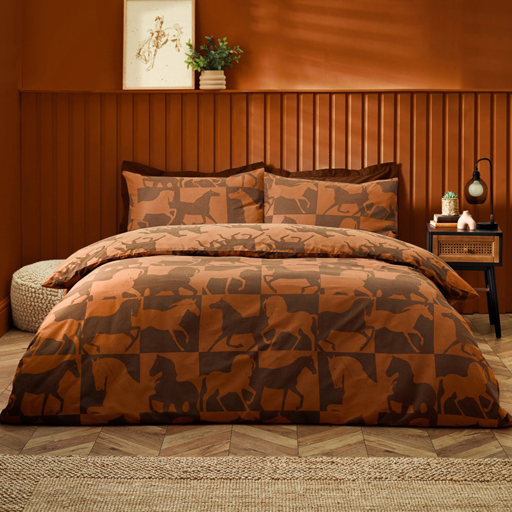 Give your bedroom decor a touch of nature with this furn. Herve Reversible Duvet Set. Inspired by the notion of wild horses galloping free in the desert, Herve draws from ancient ideas that painted running horses are meant to welcome good fortune, peace, and riches in the home. This design is reversible, with one side showing the horses in patchwork while the other depicts them running free, perfect for a midweek refresh.