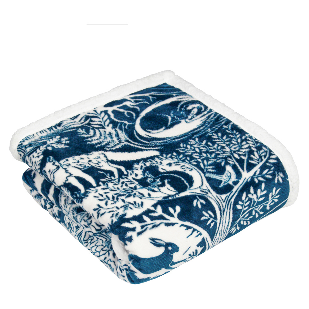 Experience the cosy embrace of the Winter Midnight Woods Fleece Throw. Its woodblock-inspired print showcases a captivating array of woodland animals and trees, bringing the beauty of nature indoors. Luxurious 230gsm microfleece creates an irresistibly soft and subtly shimmering front, while a plush optic white Sherpa reverse provides ultimate warmth. This durable and snuggly throw measures 130 x 150cm.