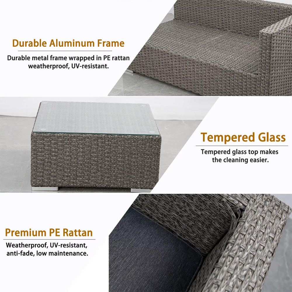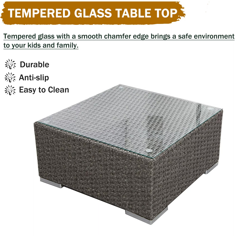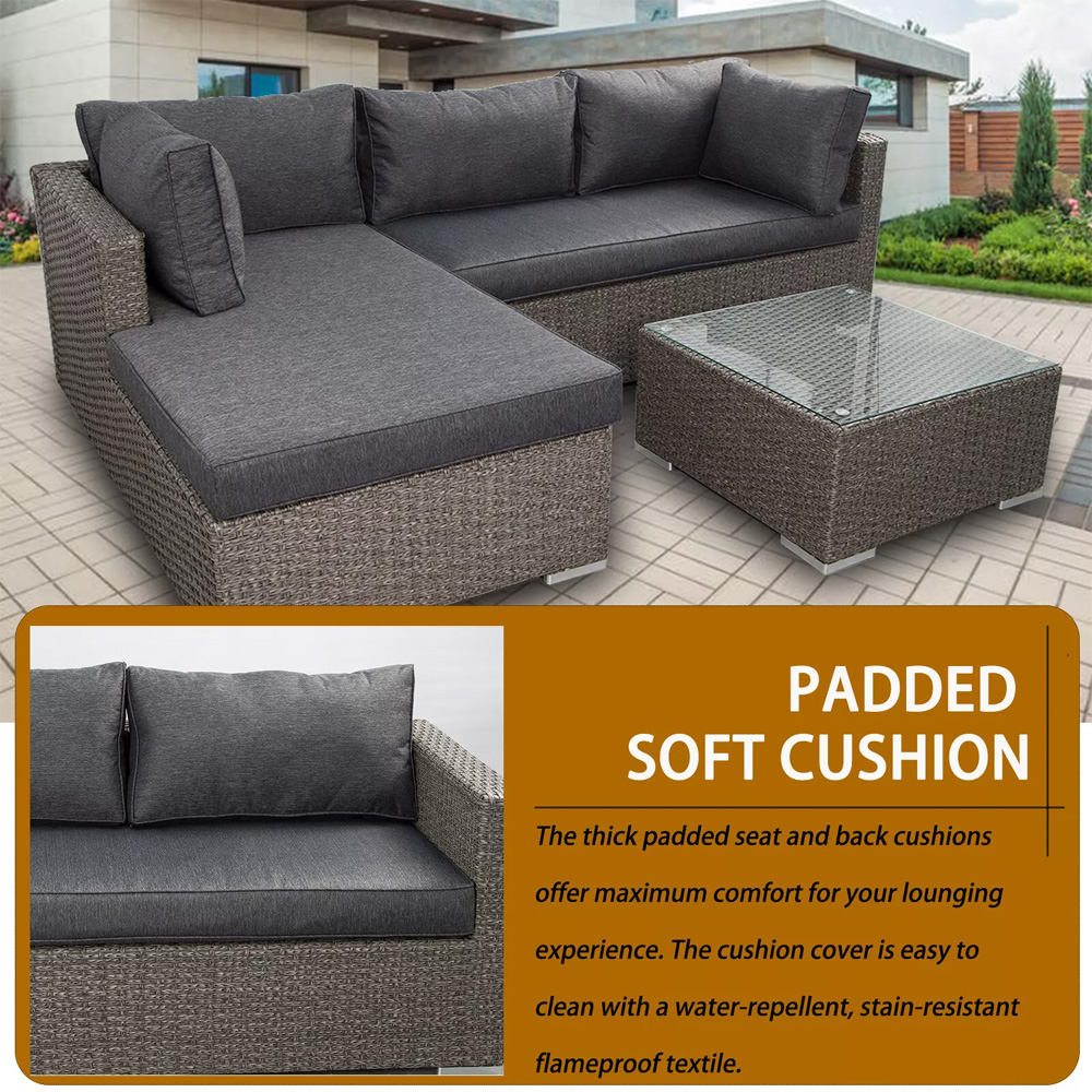 Transform your outdoor area into a stylish haven with this fully assembled, three-piece L-shaped rattan corner sofa set. Expertly crafted with hand-woven, premium PE rattan around a robust steel frame, this set is designed to withstand all weather conditions, ensuring long-lasting enjoyment in any garden or patio. The set features a tempered glass coffee table, perfect for drinks and snacks, alongside thick, padded seat and back cushions that promise ultimate comfort as you dine or unwind.