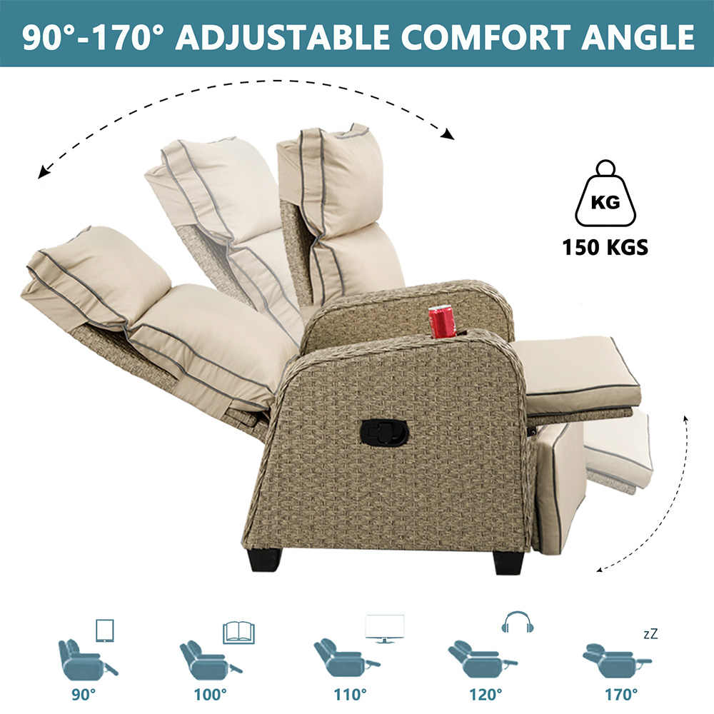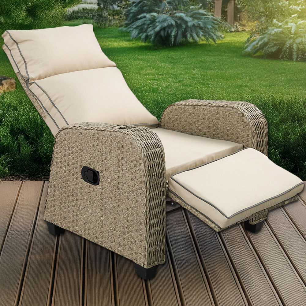 Indulge in the ultimate outdoor relaxation with this elegantly designed reclining chair. Its traditional reclining mechanism, plush cushioning across the back, seat, and footrest, ensures exceptional comfort whether you're sitting or lounging. A convenient cupholder keeps your drinks close at hand while you soak up the sun. The light cream cushions and pale brown wicker rattan create a bright, summery feel, perfect for adding a touch of elegance to your garden. Its sturdy yet lightweight steel frame guarantees years of enjoyment. This chair is designed for effortless relaxation, season after season.