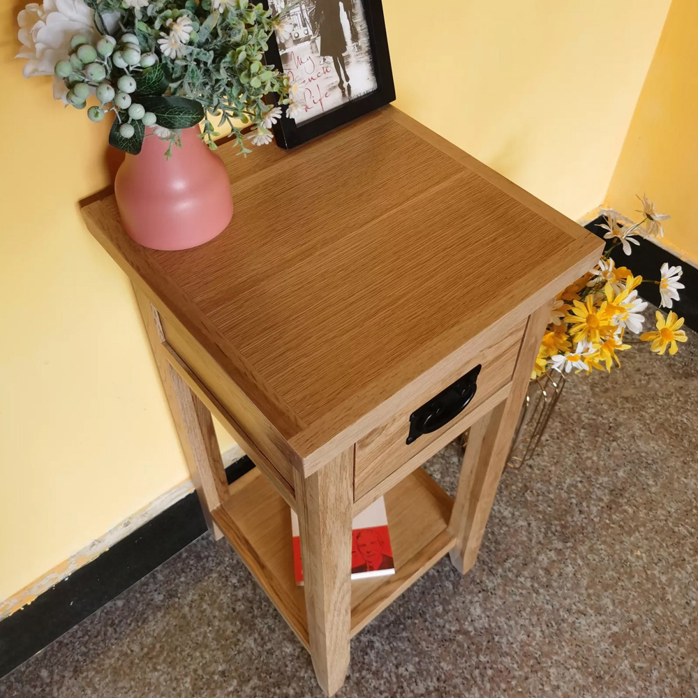 This Furniture One side table, finished in yellow, elevates your home décor with a touch of classic charm. The oak lamp table design incorporates a single drawer and shelf, perfect for displaying a lamp, decorative sculpture, or even using as a telephone table. Its compact size ensures it fits seamlessly into any room, providing a practical surface wherever you need it, whilst the handy drawer and shelf offer additional storage solutions for spare batteries, personal items, or handy notepads and pens. The drawer is finished with an antique-style iron handle, adding to the authentic antique effect.