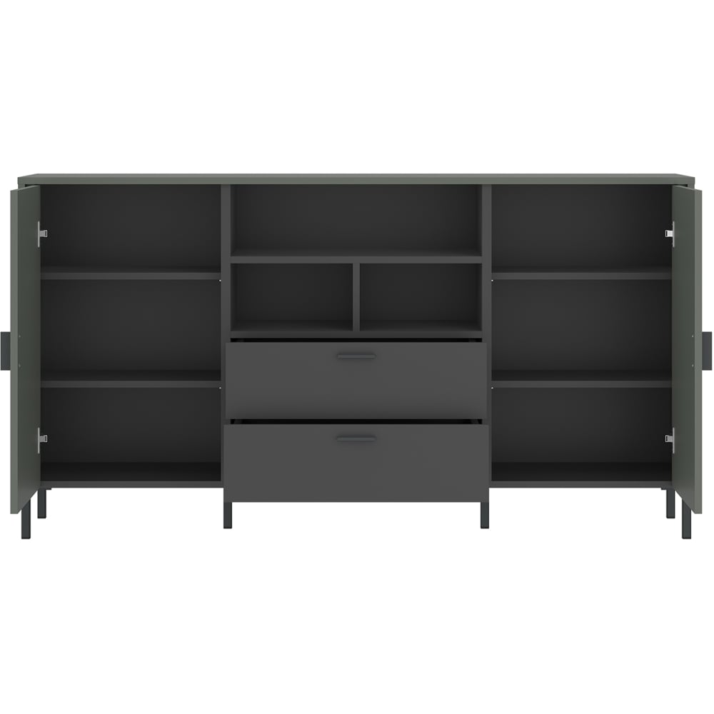 The Arundel 2-door, 2-drawer sideboard with 3 shelves is a stylish addition to any home. Its chic grey-green hue and sturdy chipboard construction guarantee both beauty and durability. Enjoy smooth operation with the full-extension ball-bearing drawer glides and soft-close doors. High metal legs give it a modern feel that complements various interior styles, from boho to vintage. Perfect for living or dining rooms, it offers ample storage without compromising on timeless design.