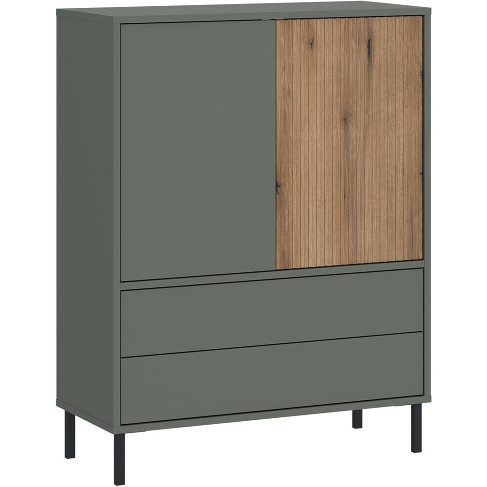 Add a touch of understated elegance to your space with the Darwin Green and Oak Sideboard. This stylish piece boasts a sophisticated grey-green finish complemented by warm oak accents, creating a versatile design that effortlessly blends style and practicality. Behind its two doors, you'll find ample storage with two spacious drawers and a metal rail, all smoothly gliding on ball-bearing runners and featuring a convenient push-to-open mechanism. The sideboard's elevated design, thanks to its sleek metal legs, makes it a perfect fit for a variety of interior styles, from eclectic and modern to loft-inspired and industrial.