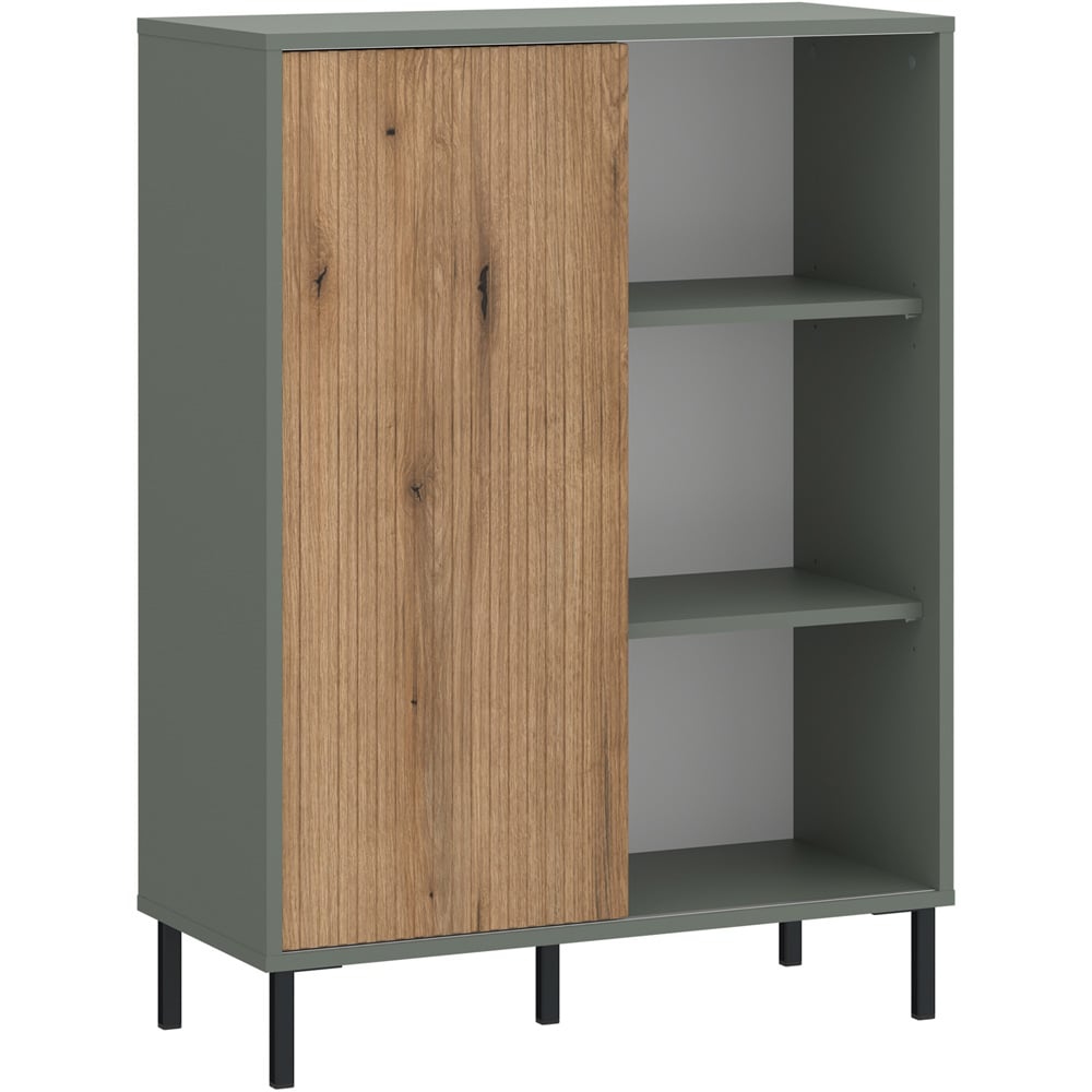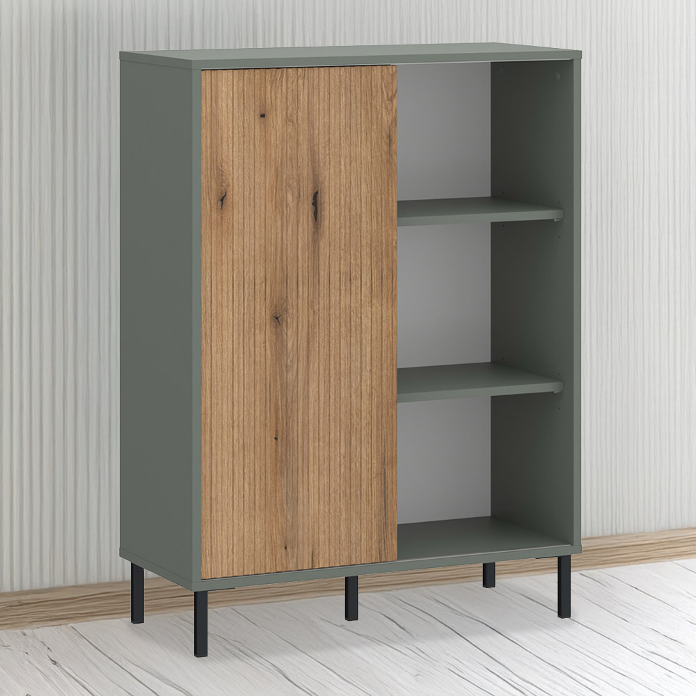 Stylish storage meets modern design in the Darwin Green and Oak Sideboard. This statement piece features a grey-green body and a grooved oak sliding door, seamlessly blending into loft, modern, vintage, or boho interiors. As part of the Darwin collection, it coordinates beautifully with other pieces. Its sleek silhouette is elevated by high metal legs, adding a chic touch to any room.