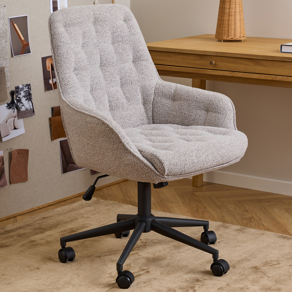 Give your home office a lift with the Erik Gas Lift Desk Chair in Monza Beige. This chair isn't just about looks; it's designed to enhance your daily grind. Upholstered in a soft, curly textured Monza beige fabric with tufted detailing, it brings a touch of visual charm while promising lasting durability thanks to its fire-resistant construction. Adjust the height from 47 cm to 57 cm with the gas lift, and enjoy the freedom of movement and stability provided by the swivel function. Ideal for any home office or library, it’s where comfort meets functionality.