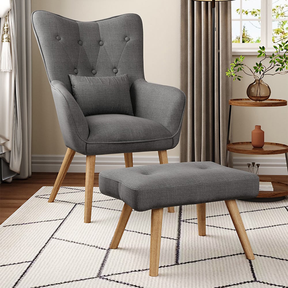 Portland Dark Grey Modern Button Tufted Wing Back Chair with Footstool