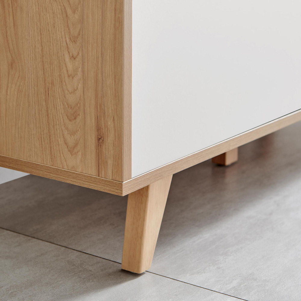 With its sleek, minimalist design and a touch of Scandi influence, the Bisset medium sideboard brings both style and practicality to your living space. Perfect for the living room, dining room, or bedroom, it offers a spacious top surface for display, complemented by a combination of a cupboard and three drawers for discreet storage, keeping everything neatly tidied away. The cupboard and drawer fronts feature an off-white finish (which may appear light grey in some lights), contrasting beautifully with the pale oak colour of the surrounding frame, handles, and legs. Crafted with durability in mind, the top section is made from robust wood composite, while the legs are solid rubberwood. The sides, top, and handles are finished with a scratch-resistant, pale oak-effect melamine veneer. To complete your coordinated look, matching bedroom and living room furniture is available within the Bisset range. Minimal assembly is required – simply attach the legs and handles, minimising hassle.
