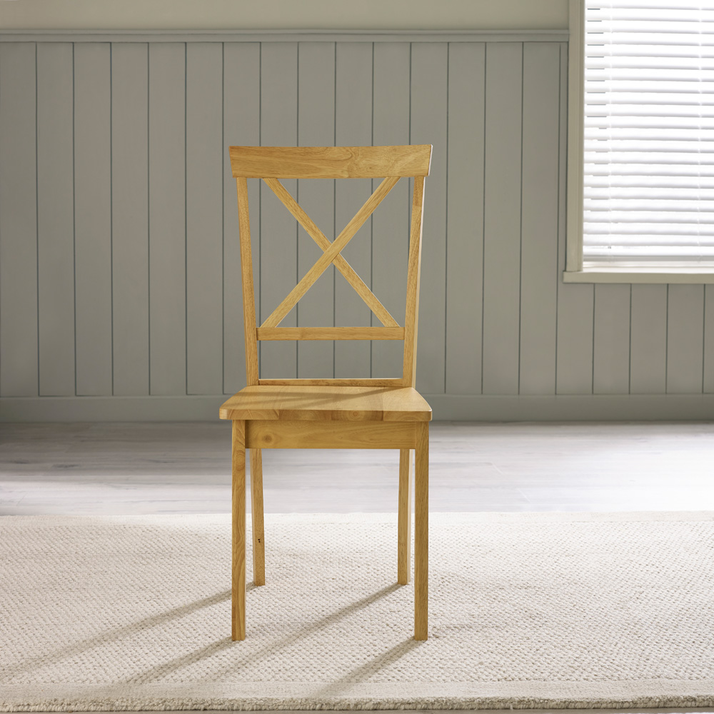 Accompanying the table, the Marros oak-effect cross-back solid wood dining chairs offer a delightful twist on classic traditional dining furniture styles. The cross-back design evokes a French cottage feel, while the oak-effect stain adds a touch of warmth. Constructed from solid 100% rubberwood, these chairs are both durable and stylish, promising to enhance your dining experience.