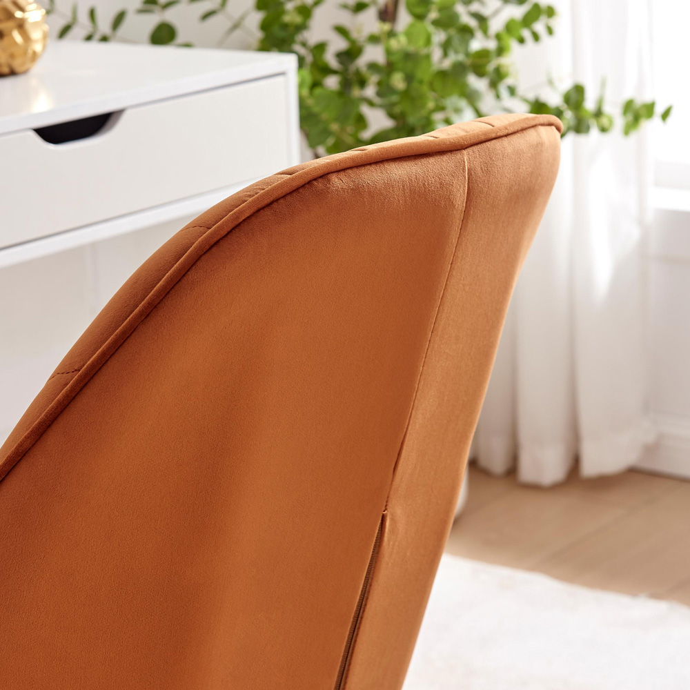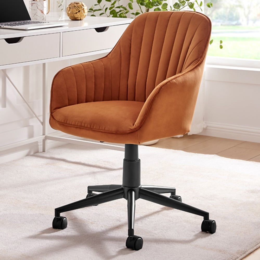 The Booker orange velvet office chair offers a stylish and contemporary seating solution for your office, bedroom, gaming setup, or workstation. Its sophisticated tub design showcases vertical piped stitching, with a backrest flowing elegantly into armrests. Upholstered in soft-touch orange velvet for a fashionable look with retro undertones, it features a black metal frame with five castor wheels for effortless mobility. Enjoy the swivel function and height adjustability thanks to its gas lift mechanism. Ergonomically crafted to provide support where it's needed most, ensuring comfort while you work, study or game. Also available in black and brown faux leather; be sure to explore the complete Booker collection.