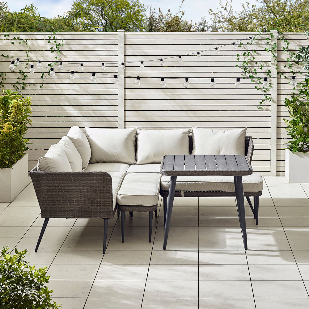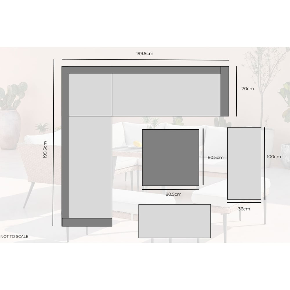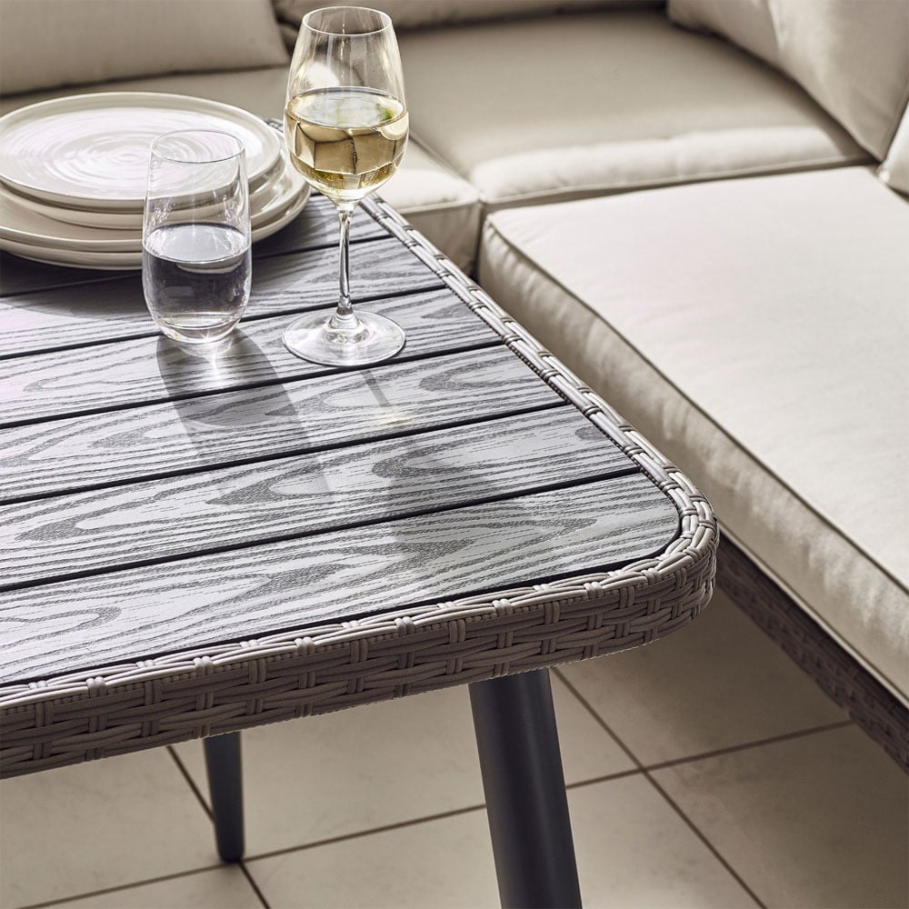 Relax and entertain in style with the Furniturebox Capri Rattan 9 Seater Corner Dining Sofa Set in Grey. This spacious outdoor seating solution includes a compact square plywood table, two two-seater benches, and a five-seat corner sofa, comfortably accommodating nine guests. The modern design blends industrial and rustic aesthetics, perfect for patios, decks, conservatories, or pergolas. The PE rattan is stylishly woven over a lightweight yet sturdy steel frame. The durable, easy-to-clean plywood tabletop features a wood-grain effect. Deep-filled cushions (8cm seat, 6cm back) provide exceptional comfort. The UV-resistant PE rattan, plywood, and cushions resist fading, while the weather-resistant frame and splashproof cushions ensure practicality. For best results, store cushions indoors during wet weather and winter. A water-resistant (not waterproof) cover is included. Dimensions: Left-hand sofa: 200cm L, Right-hand sofa: 200cm L, Depth: 60cm, Back height: 70cm, Seat height: 31cm. Protect your investment with our durable, waterproof garden furniture covers.