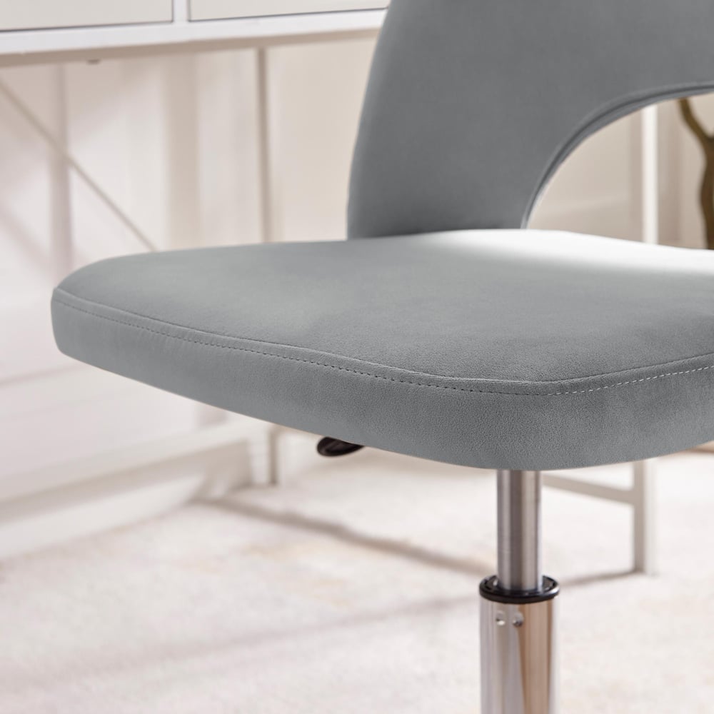 Introduce a touch of elegance to your workspace with the Courtney grey velvet office chair. Ideal for studying, gaming, working, or creating the perfect beauty station, the Courtney chair blends modern design with essential comfort. This stylish grey and silver chair features a rounded back with a cut-out design for enhanced ventilation, complemented by a foam-padded seat and back, all upholstered in soft-touch grey velvet. Supported by sleek silver chrome legs with five castor wheels for effortless movement, it also offers a swivel function and adjustable height with a gas lift mechanism. Also available in pink velvet, explore the full Courtney range to find your perfect match.
