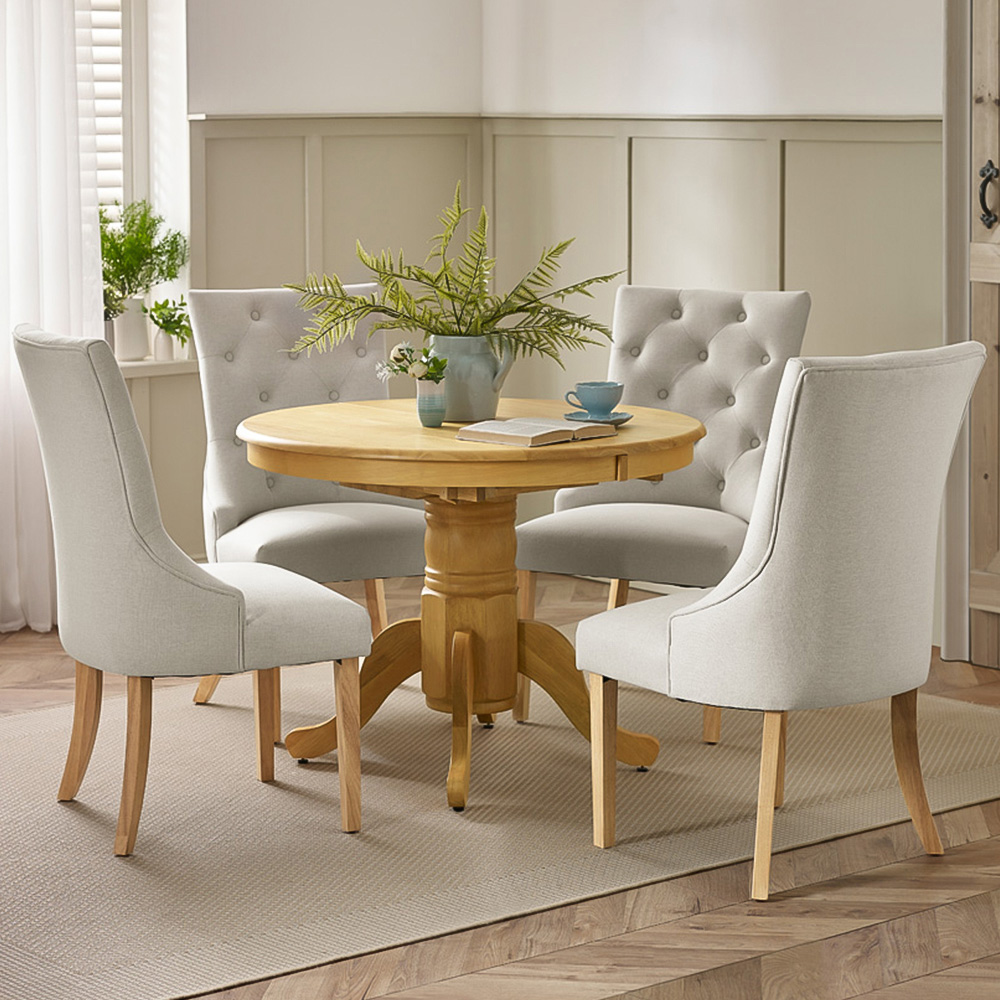 Redefine your space with the Furniturebox Fowey Kensington 4 Seater Oak Effect Wooden Extendable Dining Set. The Fowey round wooden extending dining table with pedestal leg and oak effect stain is all about that chic rustic farmhouse style. This table will comfortably seat 4 when closed and 6 when extended. Clean lines, sturdy design, rounded edges to the tabletop and sitting on four feet jutting from that central pedestal leg, this table will look fab in any modern home, whether you're going for warm neutrals, that French elegant cottage look or even as part of an eclectic maximalist space. Constructed from solid 100% rubberwood with a warm oak coloured stain, this extendable dinner table is sturdy, durable and will look great while doing it. The Fowey uses a simple butterfly mechanism; gently pull on either end of the table to open the sliding mechanism and reveal the extension piece concealed under the top. Lift and unfold the extension piece to create the additional length. The Kensington dining chair in stunning beige fabric and oak-effect legs is the ultimate in dining chair opulence. It pairs modern dining styles with traditional and bright materials for a versatile look. Featuring a tall, scoop back design that allows you and your guests to lean back and feel supported by the wrap-around arms, upholstered in gorgeous beige linen-look fabric that has a slightly textured weave, with stylish fabric-covered Chesterfield-inspired button tufting and diamond stitching. Resting on oak-effect legs to complete the modern Regency look, perfect for that Bridgerton-inspired dining room, the thick, filled seat cushion is supportive and comfortable and upholstered in durable beige linen-look fabric.