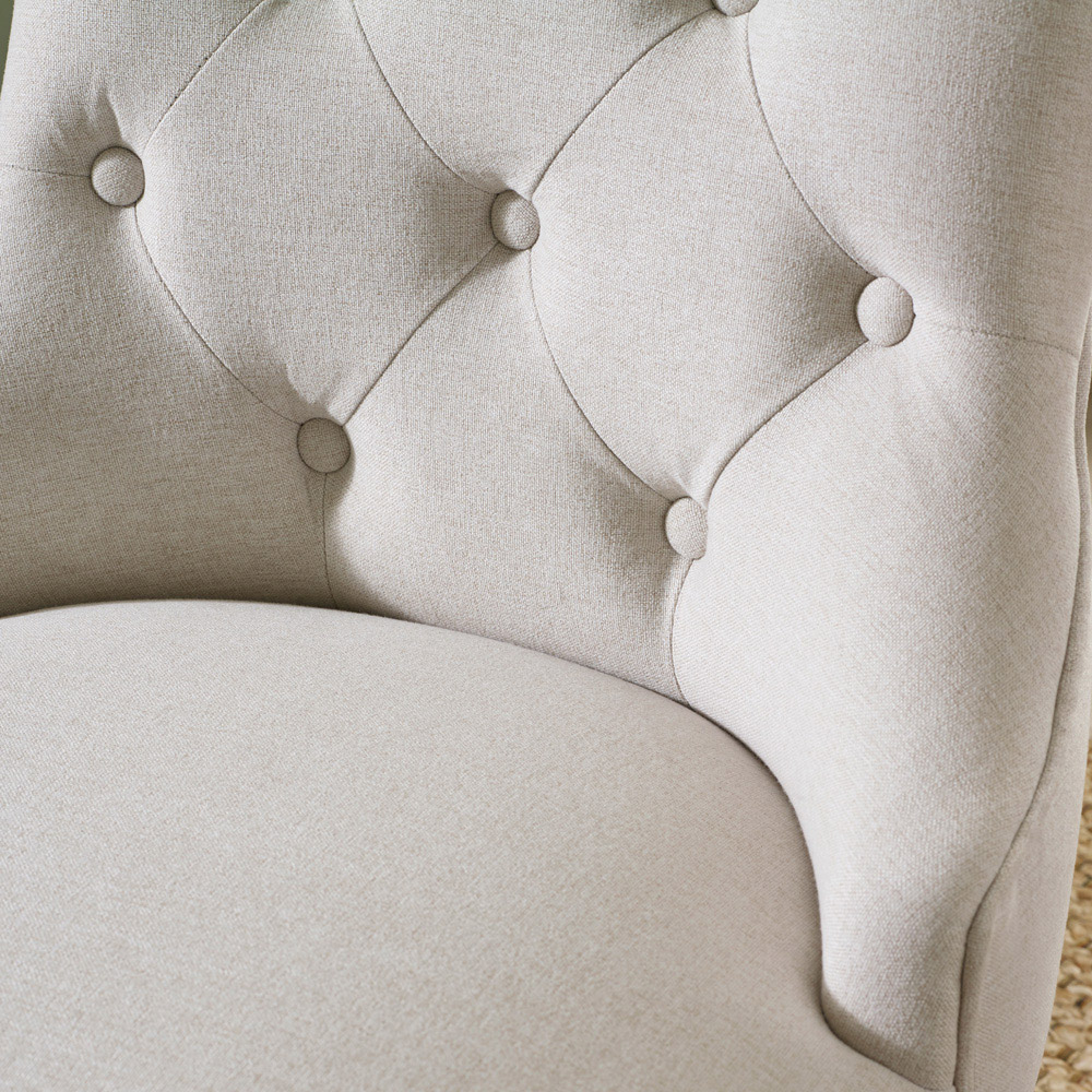 - Luxurious beige fabric chair with Chesterfield-inspired tufting