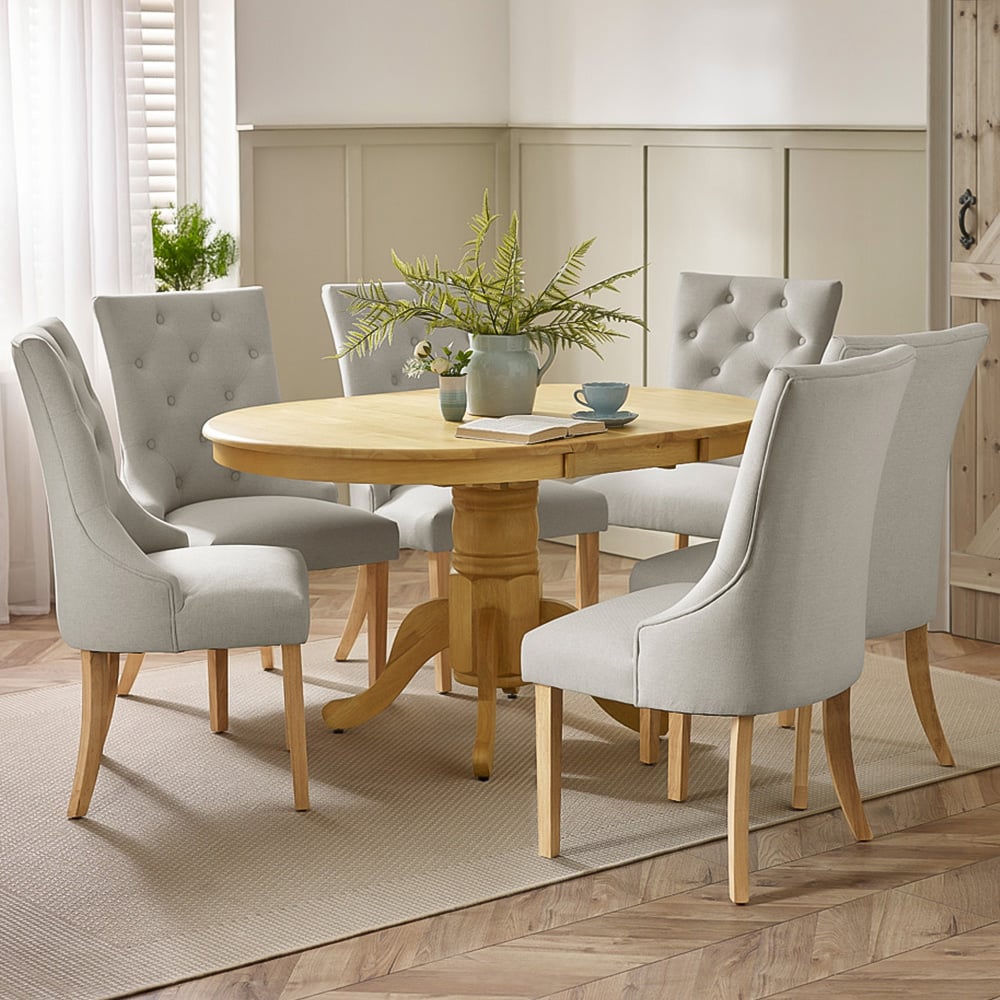 Redefine your space with the Furniturebox Fowey Kensington 6 Seater Oak Effect Wooden Extendable Dining Set. The Fowey round wooden extending dining table with pedestal leg and oak effect stain is all about that chic rustic farmhouse style. This table will comfortably seat 4 when closed and 6 when extended. Clean lines, sturdy design, rounded edges to the tabletop and sitting on four feet jutting from that central pedestal leg, this table will look fab in any modern home, whether you're going for warm neutrals, that French elegant cottage look or even as part of an eclectic maximalist space. Constructed from solid 100% rubberwood with a warm oak coloured stain, this extendable dinner table is sturdy, durable and will look great while doing it. The Fowey uses a simple butterfly mechanism; gently pull on either end of the table to open the sliding mechanism and reveal the extension piece concealed under the top. Lift and unfold the extension piece to create the additional length. The Kensington dining chair in stunning beige fabric and oak-effect legs is the ultimate in dining chair opulence. It pairs modern dining styles with traditional and bright materials for a versatile look. Featuring a tall, scoop back design that allows you and your guests to lean back and feel supported by the wrap-around arms, upholstered in gorgeous beige linen-look fabric that has a slightly textured weave, with stylish fabric-covered Chesterfield-inspired button tufting and diamond stitching. Resting on oak-effect legs to complete the modern Regency look, perfect for that Bridgerton-inspired dining room, the thick, filled seat cushion is supportive and comfortable and upholstered in durable beige linen-look fabric.
