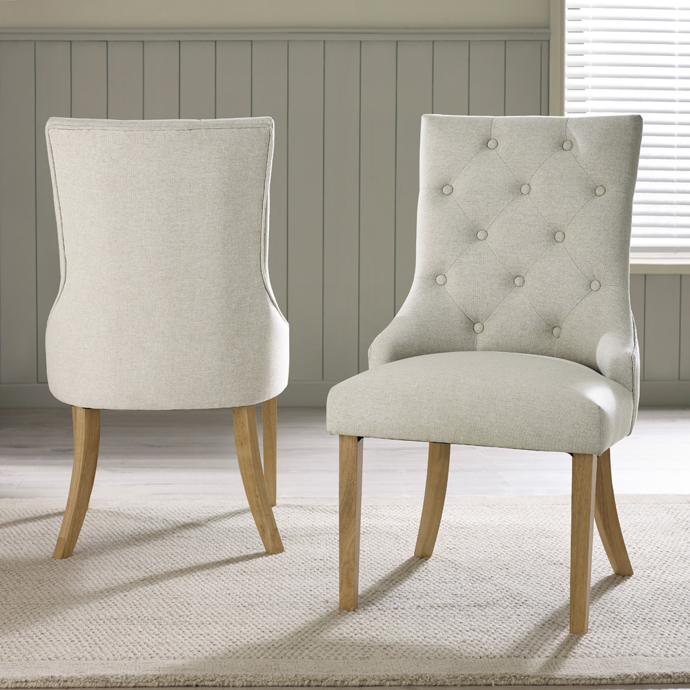 - Luxurious beige fabric chair with Chesterfield-inspired tufting