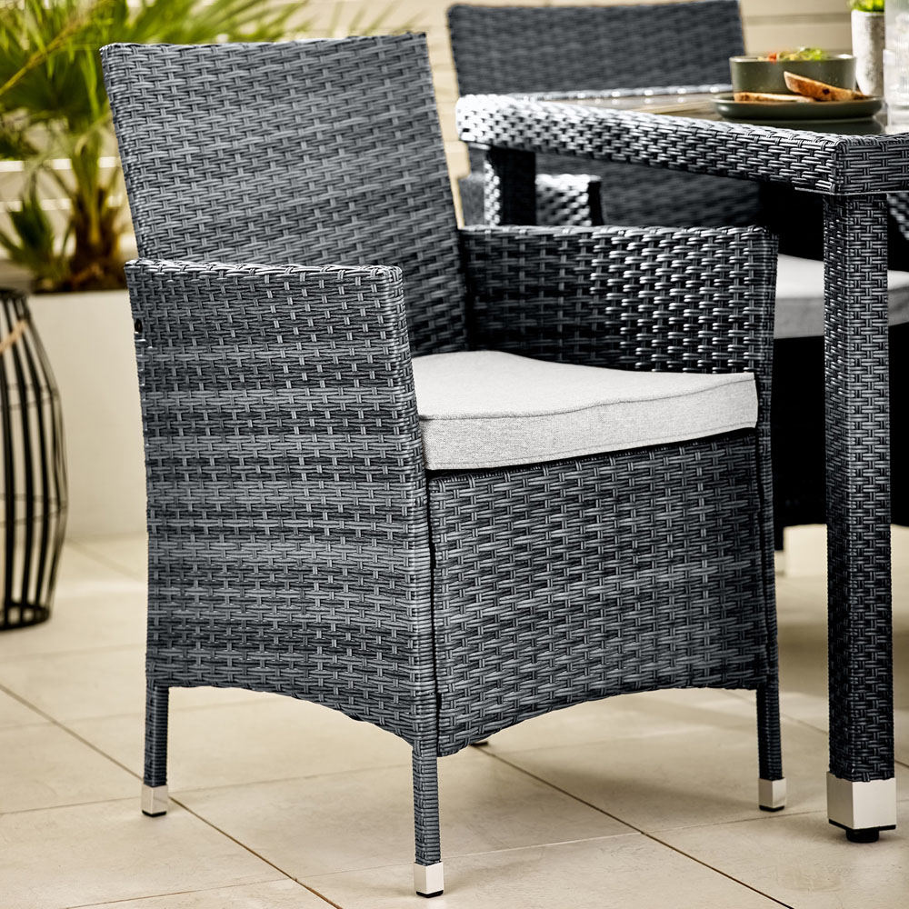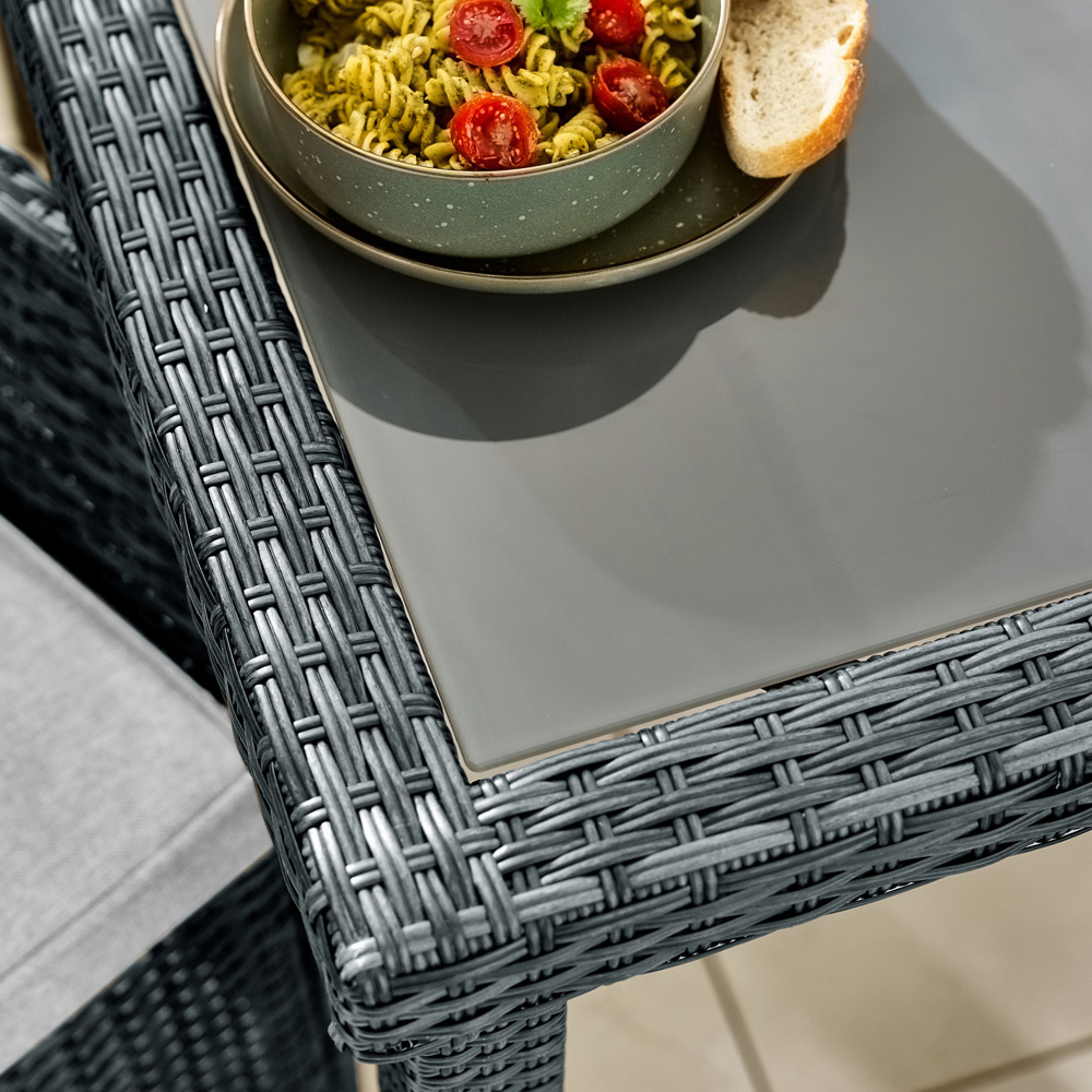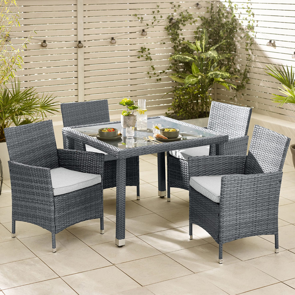 Dine outdoors in style with the Grenada Grey Rattan 4-Seater Outdoor Dining Set. Perfect for smaller gardens, this set includes a square glass-topped table and four comfortable chairs, each with a cushion. Clean lines and subtle curves create a modern design that suits any outdoor space. The stylish PE rattan is expertly woven around a strong steel frame, complemented by polished steel feet. Enjoy superior comfort with the generously padded (5cm thick), splash-proof cushions. The 5mm tempered glass tabletop is both elegant and easy to clean. The PE rattan and cushions are UV resistant, and the frames are weather resistant. To prolong the life of your cushions, store them indoors when not in use and allow them to dry thoroughly if they get wet. A water-resistant cover is provided for extra protection (please note: this is not fully waterproof.