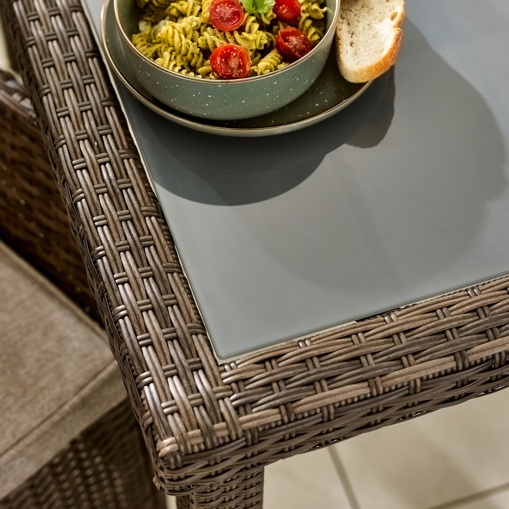Dine outdoors in style with the Grenada Brown Rattan 4-Seater Outdoor Dining Set. Perfect for smaller gardens, this set includes a square glass-topped table and four comfortable chairs with 5cm thick, splash-proof cushions. The modern design, with its clean lines and subtle curves, suits any garden aesthetic. Expertly woven PE rattan covers a sturdy steel frame, complemented by sleek polished steel feet. The 5mm tempered glass tabletop is easy to clean and adds a touch of contemporary elegance. The PE rattan and cushions are UV-resistant to prevent fading, and the frames are weather-resistant. To prolong the life of your cushions, store them indoors when not in use and allow them to dry thoroughly after exposure to rain. A water-resistant cover (not fully waterproof) is included for extra protection. For complete weatherproofing, browse our selection of durable garden furniture covers.