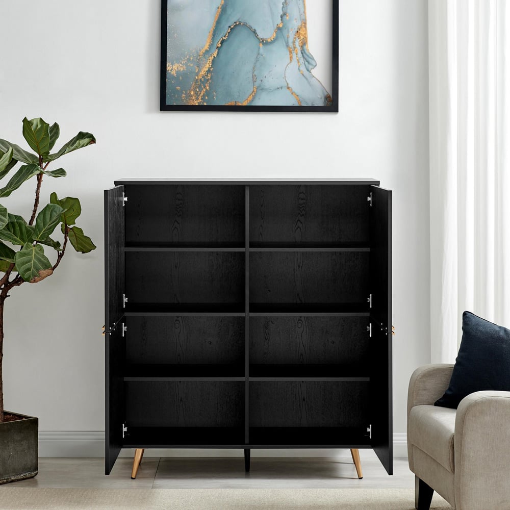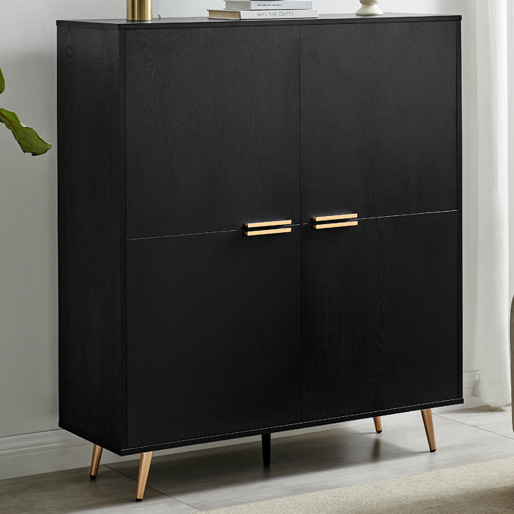 The Ivala large sideboard is a striking storage solution, equally at home in a living room, dining room, or bedroom. Its expansive top offers ample display space, while four separate cupboards, each with an internal shelf, provide discreet storage. The sleek, modern design exudes minimalist glamour. Constructed from robust wood composite with a scratch-resistant black textured melamine veneer, it's finished with elegant, contrasting copper-coloured metal tapered legs and pull handles. Complete the look with matching items from the Ivala range, available for bedrooms and living rooms. Minimal assembly is required – simply attach the legs – for maximum convenience.